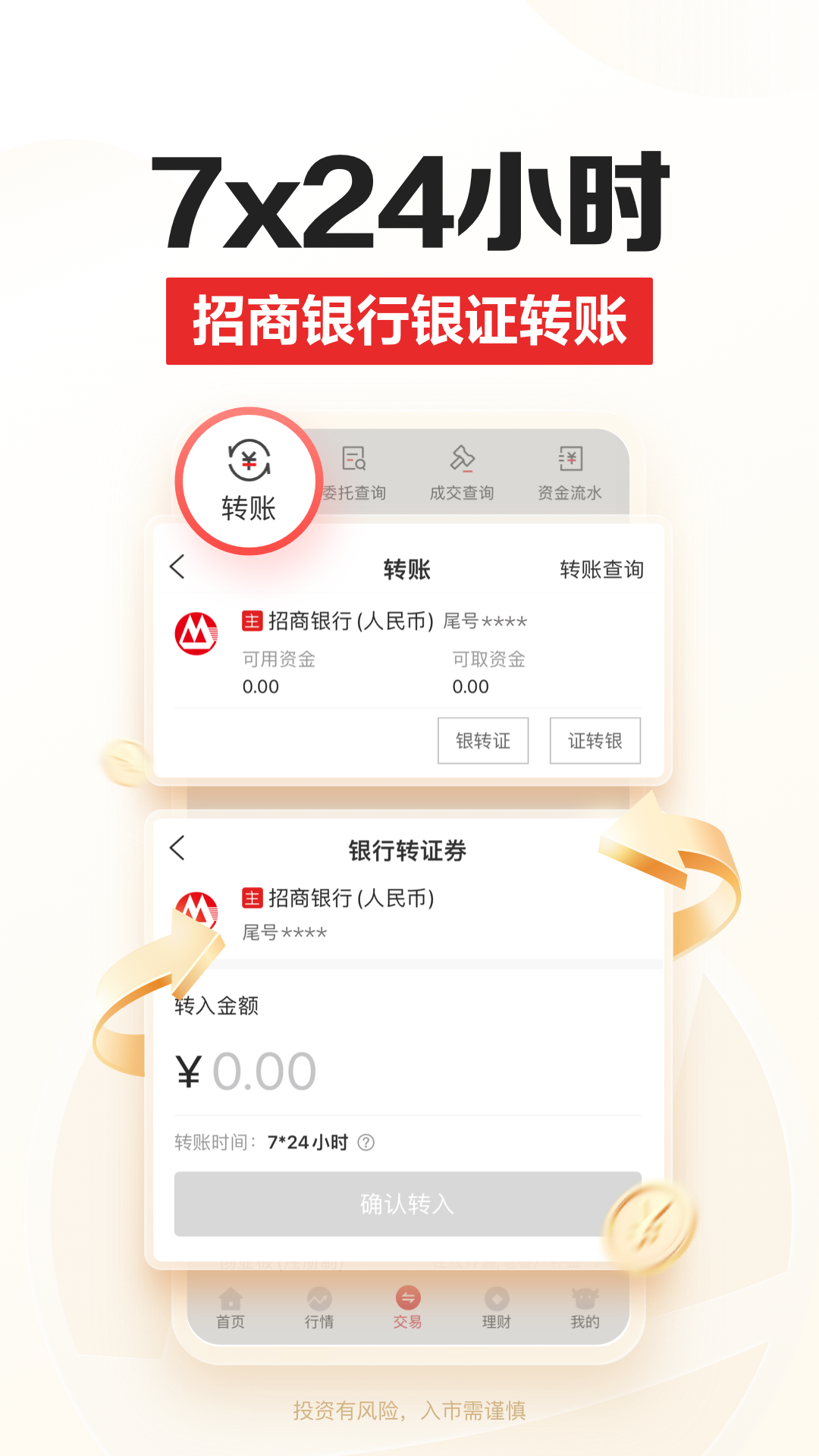 免责申明: vivo应用商店仅为信息发布平台,不对第三方发布的金融产品信息真实性及准确性负责,也不提供投资、理财、贷款等服务。vivo和金融产品之间不存在任何关系,不构成任何担保或承诺。提醒您使用此类应用时提高风险意识,勿将身份证号码、银行卡密码、验证码等敏感信息透露给第三方,如您通过vivo应用商店进入第三方网站或应用进行投资、理财、贷款等行为,由此产生的损失,vivo不承担任何责任。 百年招商,值得信赖。招商证券APP作为炒股票、买基金,综合的财富管理服务平台,是超千万用户的选择。股市有招,提供多种选股策略服务工具;理财有招,超3000只基金申购费率1折起,逾1200只基金0元申购。选择招商证券APP,招财有道。 【独家】新客专享6.88%理财及2288元炒股大礼包 【工具】神奇九转、智能画线等选股辅助工具,帮助发现走势拐点 【选股】智能选股,选定指标简单两步轻松选股 【升级】招财号全站升级,轻松获取一手最新资讯 【改版】全新首页,信息模块化整合,更聚焦 【新增】指数赛道,选对赛道,财富加速 【升级】智能定投,轻松设置,高效投资 【福利】日日猜涨跌,月月有好礼,登录即可抽奖 【新增】工资理财,稳中求进,积少成多,盈亏每日可见