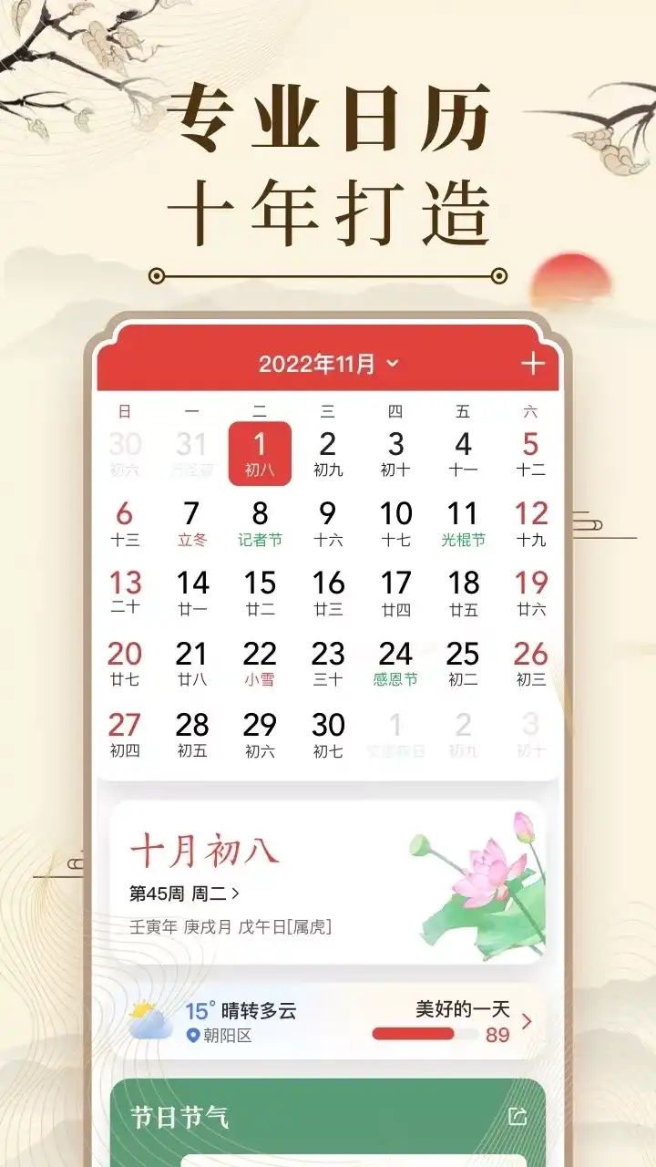 日历、农历、黄历、阴历、万年历一目了然! 日历通是一款集日历(万年历,月历),黄历(阴历,农历),节气变换,事项提醒,星座查询等各种功能为一体的日历软件。安装体积小,运行速度快,用户评价好。让传统文化与我们的现代生活更完美的结合,爱尚日历让您的生活每天过的不一样的精彩! 功能介绍: 【日历】 1)日历:精美的日期展示,完整的节日日历,周历、月历、年历随意查看,节假日、休息日清晰备注,同时还有国际节日,传统节日,佛教节日,二十四节气等,不会错过任何一个重要日子; 2)节日和节气:国内外传统节日和中国的二十四节气日期标注提醒,还有国家法定节假日上班时间调整,更有详细的科普介绍; 【万年历黄历】 万年历黄历:拥有完整的老黄历信息,详细罗列出农历节气变化,每日宜忌,吉神凶神,天干五行,同时显示公历、农历和干支历等多套历法; 【日程提醒】 日历提醒:拥有完善的提醒功能,操作简单快捷,包含日程提醒、生日提醒、纪念日提醒等,可以方便管理安排生活中的细节小事,随时随地提醒重要事项。日程清单、生日提醒、纪念日备注、倒数日,让您的生活、工作变得井井有条;