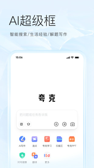 夸克,你的全能AI助手。 能在生活经验、日常学习、职场办公等多个场景帮你高效解决问题。 生活遇问题?找夸克AI超级框: ● 问啥都懂: 旅行攻略、职业选择、生活窍门... 有啥疑问,随时搜一搜。 ● 拍照问夸克: 看到不认识的花草、文物?看不懂的体检报告?拍个照,夸克AI马上告诉你。 学习没方向?夸克老师带你学: ● AI解题大师: 哪里卡壳讲哪里,更教你举一反三,学得更明白。 ● 专属AI老师: 帮你规划学习路径、制定提升计划,AI老师随时陪着你。 办公要提效?夸克AI来加速: ● 报告/论文不发愁: 输入你的主题,大纲、内容一气呵成。 ● PPT秒搞定: AI自动生成逻辑清晰、颜值在线的PPT,多端协同在线编辑。 创作没灵感?夸克AI帮你点燃: ● 图片/视频都能做: 智能润色指令,根据描述和参考生成图片、视频;海量特效模板,超多创作灵感。 ● 修图超简单: 一句话改图,去路人、改表情、提升画质,旅行大片轻松搞定。 文件照片多?交给夸克网盘: ● 照片、文件安心存:超大空间,安全存储;多端同步,手机电脑随时看。 想放松一下?夸克陪你一起嗨: ● 小说随心看: 海量热门小说无限畅读