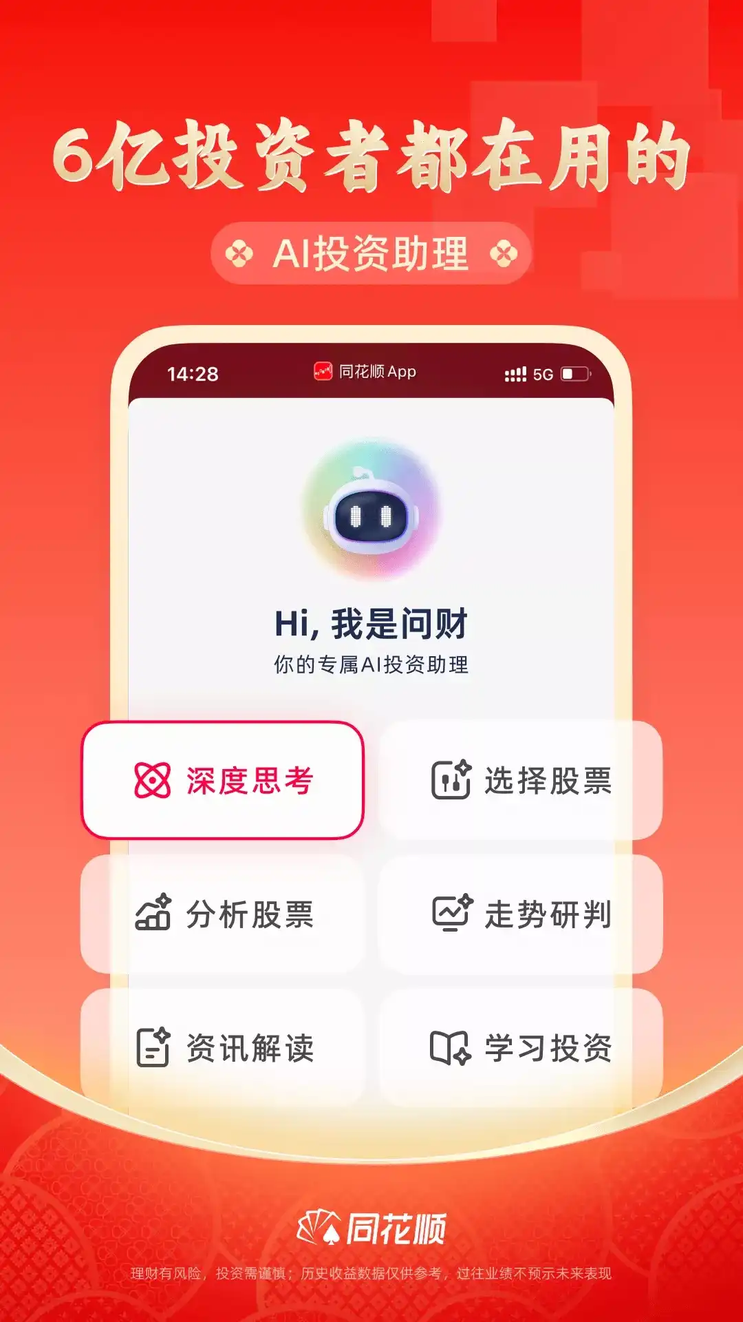 同花顺(300033),幸得您一路相伴! 同花顺 股票 炒股软件提供专业的免费实时行情,极速交易;全面金融数据,智能投资服务,沪深港美股全球行情,低佣券商开户交易,基金银行理财,融资融券,全面一站式理财服务,广大投资者的选择。 [炒股必备] 神奇九转:发现股价拐点,轻松做T 智能盯盘:盘面异动,涨跌统计,主力动向,机构观点,大事提醒,股价预警,市场尽在掌控 自选分组:多平台云同步,自选股轻松分组,自选股详细数据一目了然 筹码分布:有效识别主力建仓和派发过程,轻松找到支撑位、阻力位 问财选股:主题投资,形态选股,龙虎榜,技术指标等各种丰富选股,轻松智选个股 专属资讯:个性化资讯推荐,实时快讯,机会情报,抓紧先机 模拟炒股:免费20万资金,轻松成为高手 闪电下单:支持全国众多券商在线交易,分时快买快卖,投资下单快人一步 老牌炒股软件同花顺,凭借多年为千万股民服务经验及股民口口相传,在各色炒股、理财、投资软件中脱颖而出,是股民一致选择! 客服热线:952555 软件内直接反馈:个人中心-帮助与反馈-提建议