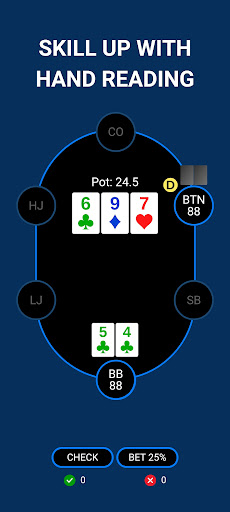 边玩边学!扑克训练器提供五项训练,助您精通扑克,无论您是新手还是老手。我们的扑克模拟器可帮助您提升牌技,建立自信,赢得更多!五项训练专为您量身定制,助您学习扑克。<br><br>训练模块:<br>- 翻牌前:像职业选手一样,使用 GTO 范围练习翻牌前,或自定义您自己的范围。<br>- 翻牌后:通过实时胜率计算提升牌局阅读能力。<br>- 牌型排名:成为快速识别和判断牌力的专家!<br>- 最佳牌型:学习如何从三手牌中挑选最佳牌型,并确定胜负!<br>- 赔率:学习计算和掌握赔率,赢得更多!<br><br>为什么选择扑克训练器应用?<br>- 离线练习:随时随地训练。<br>- 等级提升:通过等级提升来追踪您的进步。<br>- 游戏模式:测试您的技能,像 GTO 专家一样力争高分。<br>- 即时反馈:回顾错误并从中学习。<br>- 翻牌前数据:找出漏洞,并练习解决问题的点。<br>- 免费教程:免费课程,快速学习。<br><br>随时随地的扑克工具:<br>- 赔率计算器:查看您对抗对手牌型或范围的胜率。<br>- 范围查看器:探索简单范围和 GTO 范围,或创建您自己的范围。<br><br>随时随地训练——线上线下皆可!加入成千上万的玩家,像巫师一样训练和掌握 GTO。立即开始!<br><br>注意:扑克训练器纯粹是教育性质的,不提供在线或真钱游戏。欲了解更多信息,请访问 www.pokertrainer.se。