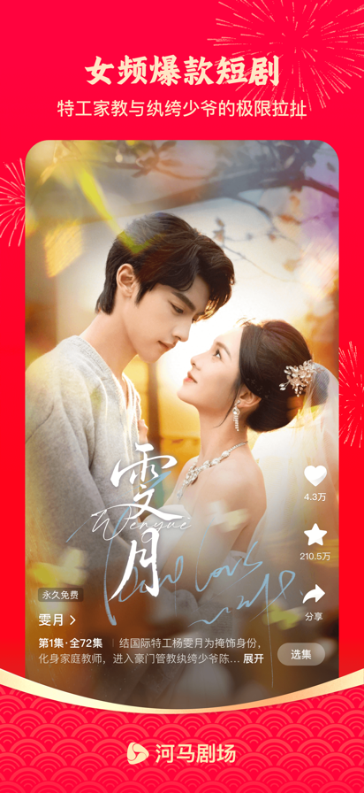 河马剧场是一款在线短剧媒体平台,为用户提供海量优质高清短剧资源,爆款热门短剧全集观看无需解锁~ 【产品功能】 ‒ 海量短剧:超多短剧资源,各类题材和风格:古装、现代都市、逆袭等想看的都有。 ‒ 高清流畅:精心挑选,把控质量,让用户享受更加清晰、流畅的观看体验。 ‒ 功能丰富:轻松浏览、精准搜索、个性喜好、收藏追剧等等,为用户提供便捷操作。 ‒ 会员特权:会员看剧免广告,后续会开放更多权益,敬请关注。 【精彩内容】 《桃花马上请长缨》《世子无双》《大梁双逆》《万里江山入我怀》《出手》《封总,太太的离婚生效了》《逍遥四公子》《出师一表真名世》《肥妻皇后不好惹》《往南忘北》《人面桃花长相忆》《林深不知云海》《盲刃》《那年阳光正好》《私藏》《窃她》《爱意满乡间》《爱你是孤单心事》《问剑》《义薄云天之从头再来》《到你看我爱别人》《独宠小农妃》《岁岁春欢》《婆婆把我捧上天》《老祖宗下山》《质子十八年归来万人嫌》《男人五十》《大夏傻神之逆袭》《离婚后,裴总哭红眼》《拨开云雾见青天》《飞龙在天》《丐世红颜》《皇帝回乡》《饥荒年我囤货养了个古代男友》《五年后她带三宝回国飒疯了》《今日天晴宜爱你》《闪婚小孕妻》《我赠妻子红缨枪》《大叔深情入骨》《哑妃》《我真不是神医》《禁欲王爷霸道宠》《替嫁老公是大佬》《每逢国庆思佳婿》《团宠老妈惹不起》《无双之最强老爸》《绝世狂萧之九天之外》《小花和爷爷》《六十大寿》《武极天尊》《伏天神君》《女婿回乡》《一剑封仙》《救命,老公竟是总裁大人》《逍遥医皇》《绝世神皇》《无敌三皇子》《凤求凰我的老婆是女帝》《女总裁的天王老公》《无极归来》《游子归家》《武极乾坤》《无双》《报告医妃,王爷他有读心术》 【自动续费会员】 -- 会员权益:可免费看全部短剧片源,享受高清画质、广告特权、以及其他增值权益。 -- 订阅周期:1周、1个月(连续包月产品),3个月(连续包季产品),12个月(连续包年产品)。 -- 付款:用户确认购买并付款后记入iTunes账户。 -- 取消续订:如需取消续订,请在当前订阅周期到期前24小时以前,手动在iTunes/Apple ID设置管理中关闭自动续订功能。 -- 续订:苹果iTunes账户会在到期前24小时内扣费,扣费成功后订阅周期顺延一个订阅周期。 隐私政策:https://api.cbn-cbm.com/huodong/quickapp/hmjc/privacy.html 用户协议:https://api.cbn-cbm.com/huodong/quickapp/hmjc/user.html 会员服务协议:https://api.cbn-cbm.com/huodong/quickapp/hmjc/vip.html 【温馨提示】 --如遇到问题,请尝试打开:“河马剧场APP-我的-联系客服”,描述问题详情,我们会跟进解决。 --若您的问题仍未解决,可进一步反馈至客服邮箱:cbnshengming@163.com --我们一直在修复bug、优化产品的路上从未停歇,您的反馈是对我们后续改善服务最大的帮助!