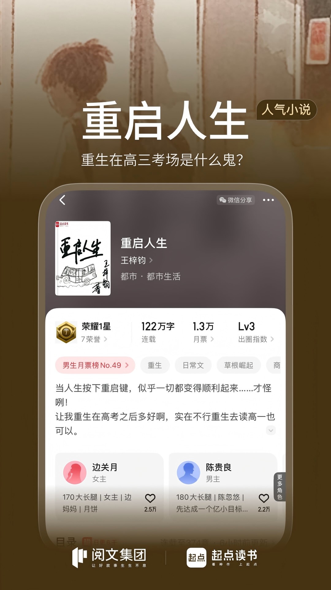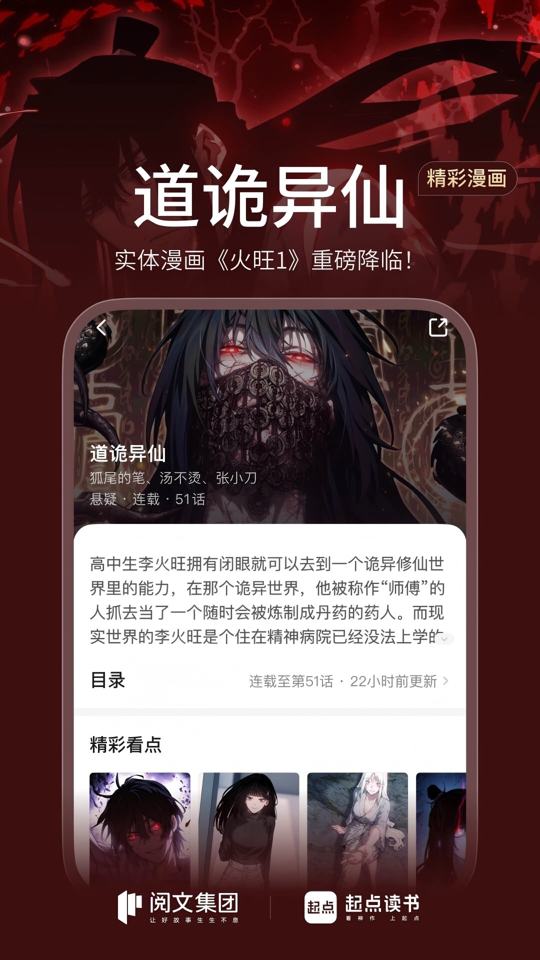 起点中文网官方移动端app,畅享正版原创网文,畅听精品有声小说,追更精彩漫画!加入书友圈,和原创作家近距离互动。 起点读书品牌全新升级,发布全新品牌主张“看神作 上起点”,致力于为用户持续提供优质且丰富的精品内容。 超热超全的原创小说书城,中国网络文学的起点,亿万忠实读者的选择~ 【热门内容】正版原著、精品有声、热门漫画火爆来袭,期待与你相遇; 《重启人生》:当人生按下重启键,似乎一切都…… 《哥布林重度依赖》:一只哥布林的赏金是三枚银币 【分类齐全】全类别热门图书随心看,玄幻、奇幻、言情、仙侠、武侠、都市、历史、游戏、科幻、二次元等,给你想要的一切! 【书单广场】不得不看的精选合辑,资深书迷倾情奉献,请允许我们拯救你的书荒; 丝般顺滑的阅读体验和百家争鸣的书评天地,让你彻底沉浸于故事的世界~ 【体验至上】赏心悦目的视觉效果及轻松舒适的阅读界面,一切为你量身定制; 【大神齐聚】名家名作汇聚一堂,速来膜拜你心中的大神~作家感言让真实的大神不再遥远; 【畅所欲言】更直接的交流、吐槽社区,更真实地和主人公共同成长; 更多贴心功能和服务等你探索~ 【免费读书】免费新书热书天天送,让你根本停不下来! 【活动中心】精彩活动集结,边玩边拿奖品,福利不停歇; 【智能推荐】私人定制,精选推荐,转角遇见你的真爱女主; 【云端同步】书架、阅读进度、书签、笔记自动云同步; 【用户书单】一步创建专属书单,从此爱上分享和发现。 ………………起点读书 • 热门原著……………… 《庆余年》:余年庆有余,不负韶华,不负卿。愿山河无恙,人间皆安。 《大奉打更人》:神探修仙,纵横大奉! 《赘婿》:愤怒的香蕉经典小说,郭麒麟、宋轶主演热播影视剧同名原著; 《龙族V悼亡者的归来》:江南新作,热血龙族,少年归来; 《长安十二时辰》:易烊千玺主演,口碑炸裂热播剧集同名小说; 《上海堡垒》:鹿晗、舒淇领衔主演科幻战争电影,江南同名小说; 《黄金瞳》:张艺兴、王紫璇领衔主演都市探险剧同名小说; 《流浪地球》:刘慈溪科幻小说,大热电影原著; 《全职高手》:蝴蝶蓝经典大作,超燃热播动漫; 《你和我的倾城时光》:赵丽颖主演热播都市商战剧,改编自丁墨同名小说; 更有《三体》、《斗破苍穹》、《星辰变》、《莽荒纪》、《琅琊榜》、《黄金瞳》、《斗罗大陆》、《萌妻食神》《异常生物见闻录》等火热原著,以及大热手游《大主宰》、《完美世界》、《斗破苍穹》原著