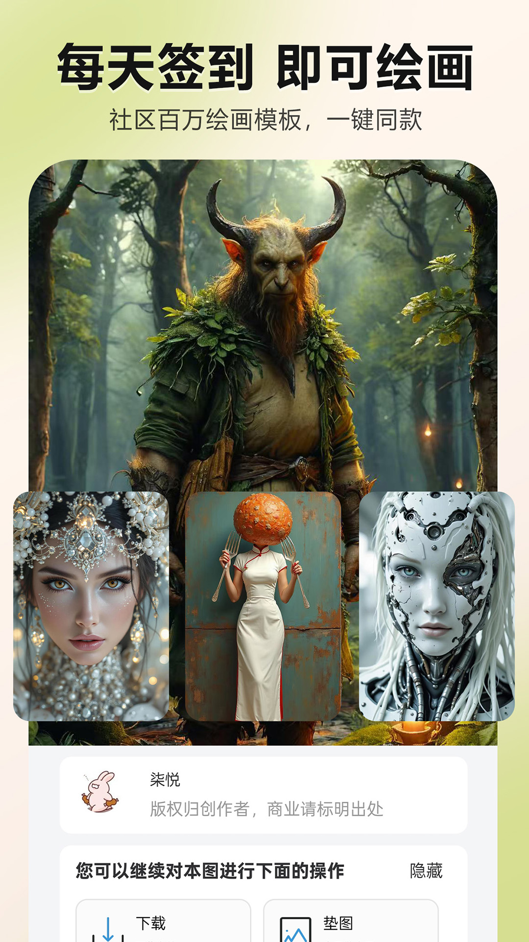 AI绘画大师,释放你的艺术灵感,全新AI绘画算法创作绝美图片,瞬间点燃你创作火花、助你高效绘制出心中所想。 【高效创作,一键成真】 AI绘画大师以其强大的算法为后盾,能够迅速理解你的创意意图,无论是细腻的风景、生动的人物,还是抽象的意象,都能在你的指尖下快速成型。告别冗长的绘制过程,让灵感与成品之间的距离,缩短至一瞬之间。 【无限灵感,随取随用】 创作瓶颈?不存在的!AI绘画大师内置了海量的灵感库,从古典艺术到现代潮流,从自然风光到都市风貌,应有尽有。无论是寻找色彩搭配、构图灵感,还是想要探索全新的艺术风格,这里都是你的灵感源泉。 【AI作图,精准呈现】 别担心技术限制,AI绘画大师的智能作图功能,让即使是没有绘画基础的你也能轻松上手。它不仅能自动优化线条、色彩,还能根据你的需求调整细节,确保每一幅作品都能精准表达你的创意。 AI绘画大师,在这里,每个人都能成为自己心中的艺术大师。