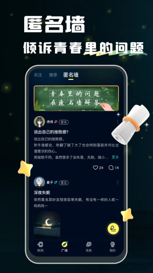 新胶囊星球app是一款匿名交友app,在这里你可以卸下伪装,做真实的自己! 这是一款以信件为主题可倾诉、聊天、交友的社交app,这里每天有众多信件等待挖掘,你可以畅所欲言的和陌生人倾诉烦恼,也可以做一个安静的倾听者。我们也希望你可以在这里遇见惺惺相惜的另一半,排解漫漫长夜的孤独。 这里共分为四个星球,不同的星球满足不同的交友需求 胶囊星球:通过圈子交朋友,帮你筛选出喜好一致的朋友,胶囊星球给你隐私感,所有评论只有信件主人可查看。 吐槽星球:发泄全部负能量,找到经历相同的TA一起吐槽令你不爽的人和事,在这里没人认识你,放心大胆的说吧! 女神星球:专为女生打造的女性交友星球,一些不想被男生偷听到小秘密可以在这里找姐妹说哦!女神星球必须通过声音认证后才能进入,保证纯净的女生交友空间! 时光星球:偶尔是不是也有矫情的小情绪,时光星球寄给未来的信件,寄出的信件至少要在一个月之后才会被挖到,你有什么要对未来说的话,尽情在这里诉说吧! 不论你是斜杠青年、文艺青年还是日常打工人,希望你可以在这里找到灵魂的共鸣,思想的碰撞,来胶囊星球做真实的自己吧!