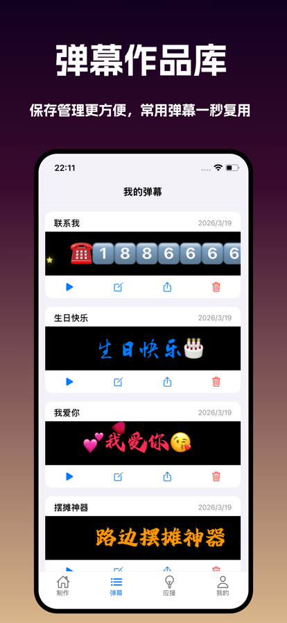 应用功能介绍 把你想说的话做成手持弹幕,应援更醒目、更有氛围。 核心功能: - 弹幕制作:输入文字,实时预览滚动效果 - 样式设置:文字颜色、背景颜色、字体选择、字号大小 - 动效调节:滚动速度、左右方向、文字闪烁 - 装饰效果:边框装饰(如飘落/玫瑰等氛围特效) - 弹幕管理:保存、播放、编辑、删除,并在列表中查看预览 - 一键分享:把应用分享给好友一起应援 - 应援荧光棒:纯色/渐变预设、发光效果、支持全屏显示 用户协议:https://docs.qq.com/doc/DZkNOZFhvRHhWTFZ5 隐私政策:https://docs.qq.com/doc/DZkNhaXJ1emhYbG9o 订阅说明 应用内包含订阅商品,部分功能需要订阅商品可使用。我们的订阅商品包含免费试用,用户可以在体验后选择是否继续使用。如免费试用到期前24小时内(或商品订阅到期前24小时内)未取消订阅即表示您同意继续使用,苹果公司会根据用户提供的iTunes 账号进行订阅费用的扣除。如悠决定不再订阅,可以前往 AppStore中完成订阅的相关取消。