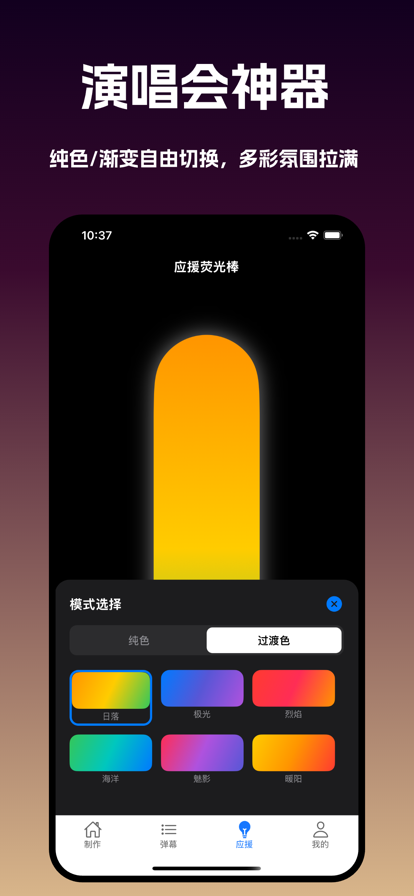 免费的打call神器 - 应援工具箱! 表白、演唱会、明星见面会、机场车站接人,各种场合等你开发! ----------------------------------------- 包含功能: 一、星星荧光棒,流光效果,更多形状正在开发中 二、普通荧光棒,流光效果 三、全屏幕渐变色,流光效果 四、摇晃——随着音乐的节奏摇晃手机,屏幕将根据节奏切换七种彩虹色 五、声控——屏幕将根据节奏调节明暗,设置界面还可以测实时音量分贝 六、文字——最多支持三行文字,可自定义文字颜色与背景色 七、滚动——滚动字幕,可自定义文字颜色与背景色,以及滚动速度 八、闪现——文字一个个从小到大出现在屏幕上,可自定义文字颜色与背景色,以及动画速度 九、写字——用笔写字的效果,文字按笔画逐渐显示,可自定义文字颜色与背景色,以及动画速度 ----------------------------------------- Tips:所有界面上下滑动屏幕可以快捷调整亮度