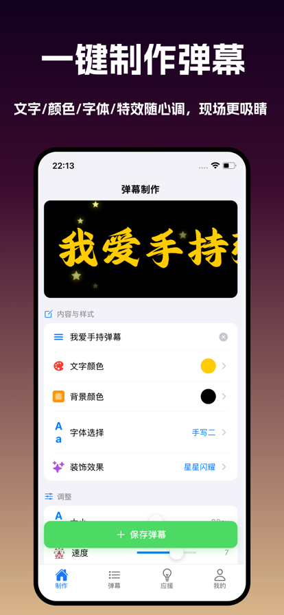 ======敲黑板======= 产品免费,无需内购 ================== 表白求爱、应援爱豆神器! 无论是在演唱会、歌迷/影迷见面会、电竞现场、机场接人、会议,还是你想表白、聊天,只需在应援弹幕中输入相应的文字,举起手机,就能成为全场最亮的仔! 【产品特色】 √免费产品,无需内购,支援爱豆不花钱! √丰富的字体颜色、字号、样式(少女体、像素体等等)选择 √可调整弹幕速度、显示方向和效果 √动效模板,一键完成整个弹幕的炫酷效果 √配色模板,一键完成字体与背景的最佳搭配 √自定义常用语