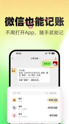 小乖记账是一款聊天式 AI 记账 App。 支持消费内容智能识别与自动分类 可以像发消息一样输入消费内容,如“早餐6,奶茶18,地铁3”,系统会自动识别金额和分类,快速完成记账,让记账变得更简单。 *核心功能* 1.AI自动记账 智能识别消费金额与分类,减少手动录入。 2.微信记账 无需打开 App,在微信里也能随手记录消费。 3.聊天记账 像聊天一样输入消费内容,自动识别金额和分类,轻松完成记账。 4.语音记账 语音输入消费内容,一秒完成记录。 5.多笔同时记账 一条消息可识别多笔消费,记账更高效。 6.账单统计 收支趋势、分类账单清晰展示,轻松看清每一笔开销。 7.AI陪伴记账 支持自定义 AI 角色,让记账更有回应感,也更容易坚持。 *更新说明* - 优化自动记账体验 - 新增或优化 AI 角色设置 - 提升日常记账效率 - 持续更新更多实用功能