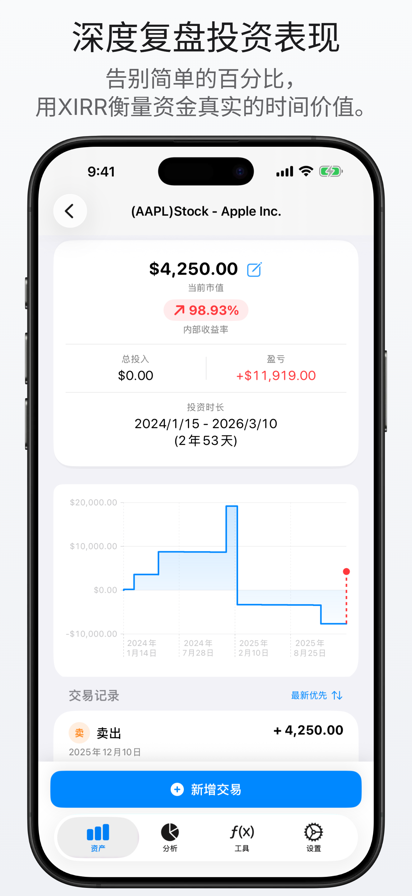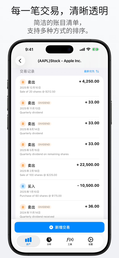 追踪。分析。增长。 VectX 是一款专为 iOS 设计的现代化投资组合追踪应用,旨在为您纷繁复杂的财务生活带来绝对的清晰度。无论是股票、基金、加密货币还是房地产,VectX 都能助您轻松管理多类资产,并利用专业级工具精准复盘投资表现。 告别“凭感觉”理财。 借助直观的界面,您可以精确记录每一笔资金流向,通过 XIRR 算法计算考虑时间价值的真实回报率,让每一分钱的增值都看得见。 核心功能亮点: 多维度投资组合管理 轻松创建多个独立的投资组合(如“美股长线”、“加密货币”、“养老定投”)。支持自定义货币、备注以及多种主题色,让您的资产列表既专业又个性。 同币种汇总分析 打破单一组合的界限。 专门的分析页面可自动识别并汇总相同币种(如所有 USD 或所有 CNY 组合)的资产数据。您可以统一查看该币种下的总资产规模、整体浮动盈亏以及跨组合的资产配置比例,实现宏观视角的财务管控。 硬核收益分析 (XIRR) 不仅是记录数字,更是分析趋势。系统自动处理买入/卖出现金流,实时计算 XIRR(扩展内部收益率)。配合趋势图表,直观展示资产随时间变化的真实走势。 专业金融工具箱 复利计算器:输入本金与预期收益,预见财富的未来价值。 XIRR 演练场:手动模拟不同时间点的现金流,在实战前洞察复杂的收益逻辑。 私密且安全的 iCloud 同步 (PRO) 您的财务数据属于您自己。VectX 采用 Apple 原生 iCloud CloudKit 技术,在您的 iPhone、iPad 等设备间自动同步,开发者无法访问您的任何私密信息。 灵活的数据导入与导出 (PRO) 数据不应被锁死。支持 CSV 格式批量导入历史交易或导出备份,方便您在电子表格中进行更深入的税务或自定义分析。 iOS 深度集成 支持快捷指令自动化记账。您可以配合 API 或爬虫,实现市值自动更新,体验无感化资产追踪。 为什么选择 VectX? 本地优先:响应极速,离线可用。 全球视野:支持多国语言及涨跌色自定义。 隐私承诺:无需注册第三方账号,数据加密存储。 升级至 VectX PRO 解锁无限投资组合数量、iCloud 云同步以及 CSV 数据管理权限,开启您的进阶财富管理之旅。 立即下载 VectX,开始精准追踪您的每一份财富增长! Terms of Use (EULA): https://www.apple.com/legal/internet-services/itunes/dev/stdeula/