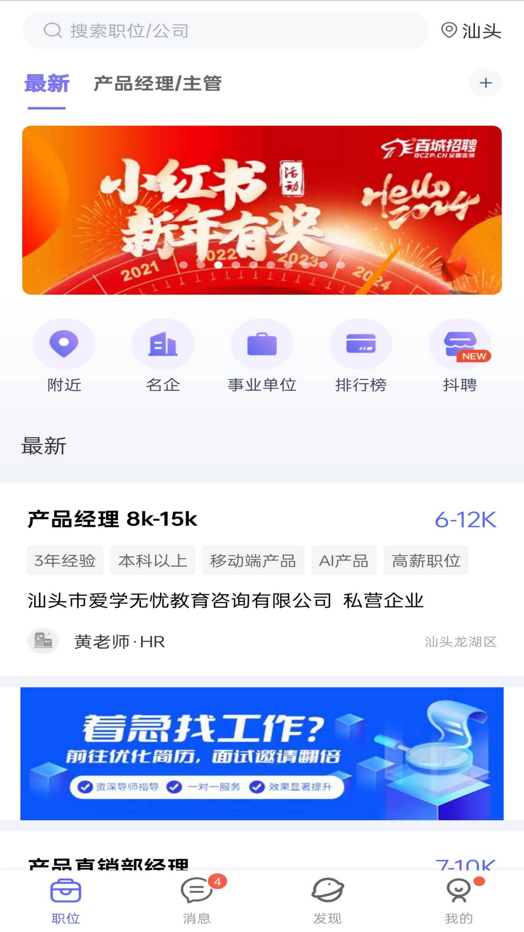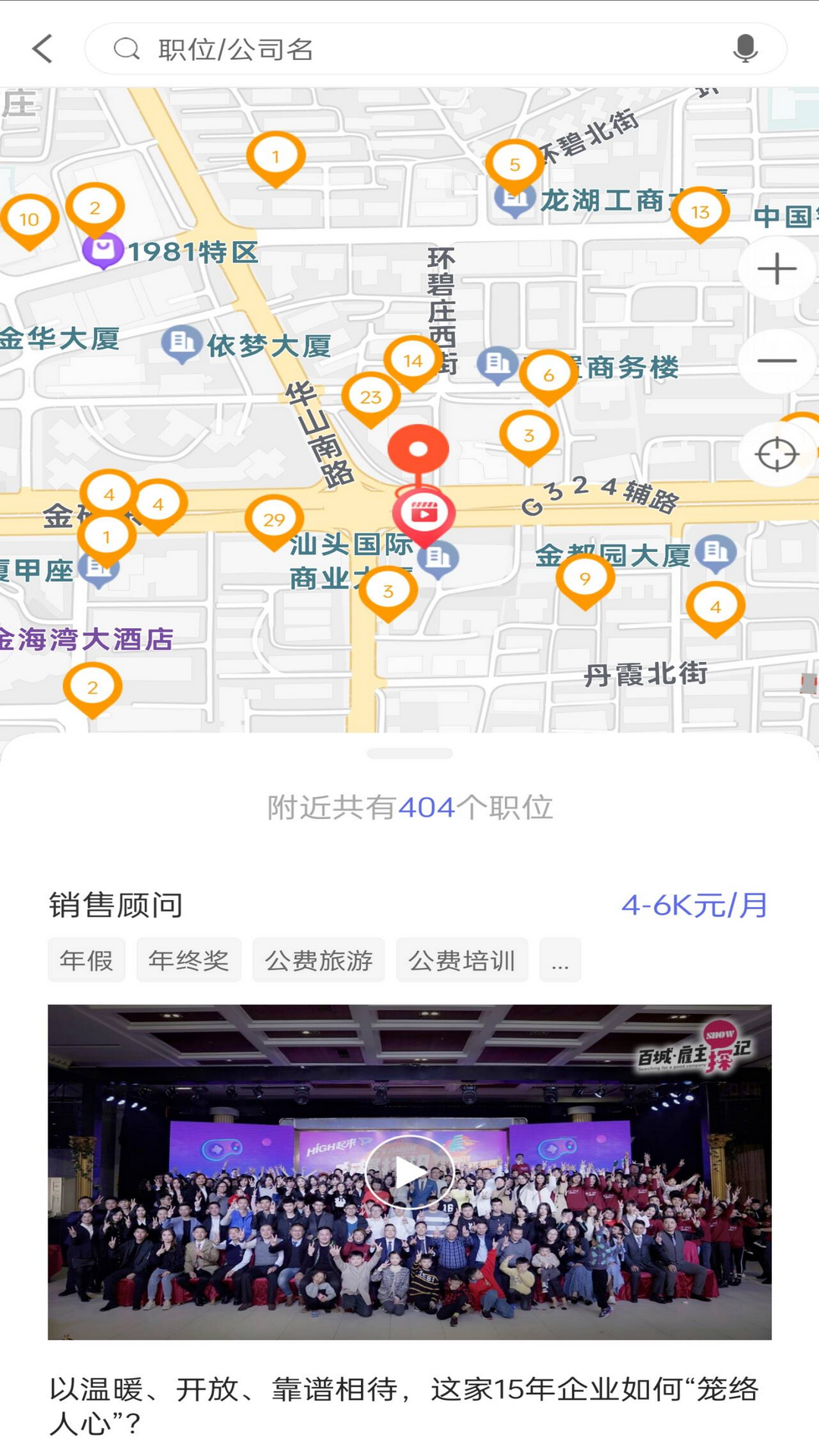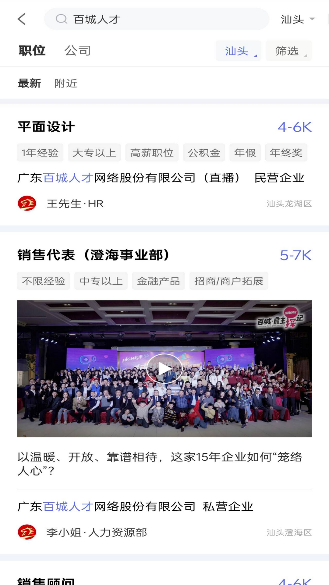 十五年深耕上百个城市站点, 万千名企品牌入驻百城招聘, 高管老板都在这里招兵买马, 海量职位、精准匹配, 明星企业、高薪求才, 极速入职、拒绝等待。 百城招聘,找工作一个APP全搞定! 【雇主揭秘】优质企业视频展现,了解办公环境再下手 【附近职位】附近工作精准搜索,附近岗位一网打尽 【直接沟通】HR、BOSS直接聊天,心仪工作立即沟通 【求职课堂】美女线上视频教学,找工作/简历/面试/职场问题轻松解决 【职位推荐】大数据分析智能推荐,海量职位精准匹配 【猜你喜欢】工作条件筛选一步到位,你喜欢什么我就给你什么 【谁看过我】哪些HR对你感兴趣一目了然,看对眼互相聊一聊 【职圈频道】讨论职场话题,解答职场疑惑,对话业内大咖,建立职场人脉 【薪酬查询】了解市场行情,你的随身求职指南针 【简历置顶】绝佳位置海量曝光,求职效果提升200% 【简历大师】高颜值简历一分钟搞定,标准好看简历轻松安排 【隐私设置】屏蔽企业、匿名显示,细节更贴心,求职更安心 【职业测评】AI人工智能测试,准确定位你的职业,大数据匹配工作岗位 【求职动态】随时查看求职简历投递进度,接收面试通知,好机会不会错过 【关于百城招聘】 百城招聘统筹近百个地方城市资源,是各行业的求职者求职找工作、跳槽必备的平台。 包括汕头、潮州、潮安、揭阳、普宁、广州、深圳、大佛山、顺德、珠海、东莞、惠州、江门、中山、梅州、湛江、汕尾、河源、茂名、韶关、云浮、清远、肇庆、阳江、厦门、福州、泉州、漳州、常州、盐城、荆州、扬州、高邮、杭州、南京、咸宁、海南、广西、柳州、南宁、桂林、九江、鹰潭、南昌、赣州、抚州、上饶、新余、威海、临沂、太原、济南、景德镇、领航人才网等全国各地近百个城市的最新全职兼职招聘信息、应届毕业生校园招聘、招聘会信息,为求职者提供各项贴心的求职服务,让找工作变得更加简单和轻松。
