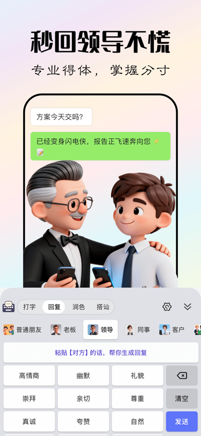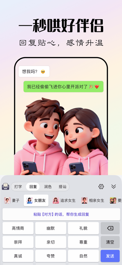高情商键盘输入法 还在为不会聊天、不会回消息而苦恼吗?还在羡慕别人聊天幽默有趣、温柔撩人、滴水不漏? 现在,只需一款 App,你也能成为情绪掌控高手、社交天才! 这不是普通的输入法,而是一个可以自定义人设、情感语气、主动撩人的 AI 聊天神器。 无论你想扮演体贴女友、霸气男友、贴心老公、高情商老板,还是模拟同事、亲友、客户、领导,统统一键搞定。 你可以选择各种语气风格: 高情商、幽默风趣、真诚暖心、崇拜式夸赞、温柔撒娇、调皮暧昧回复……,总有一种,是你想要的沟通方式。 更厉害的是,AI 还能主动开场撩人! 想发“早安”“想你了”“今晚约饭”“讲个笑话给你听”“我真的很爱你”——一句话搞定。 核心功能亮点 * 自定义 AI 人设,专属你的聊天角色 * 多种语气风格任意切换,聊天再也不尬 * 智能生成高情商回复,一秒完成 * 主动搭讪功能,打破冷场神器 * 私人语料库,越用越懂你 * 支持所有平台输入场景,聊天、评论、回复一体化 别再让冷场毁掉好感,别再为错失机会而遗憾。 你的每一句话,都可以更有温度、更有情绪、更有吸引力。 立即下载,让 AI 成为你情感世界的隐形助攻! 高级功能(需订阅解锁) * 无限制键盘自动回复 * 无限制键盘主动搭讪 * 无限制模拟聊天 * 无限使用自定义人设 提示:部分功能需订阅才能使用。订阅详情和价格将在应用内显示,可随时在 iPhone 设置中管理和取消。 通过使用本应用程序,您确认您理解并接受我们的隐私政策和使用条款: https://www.yuque.com/kkv2/tfnckn/ququncd7dgnzd83p https://www.yuque.com/kkv2/tfnckn/ysp3s0xbxztzc992