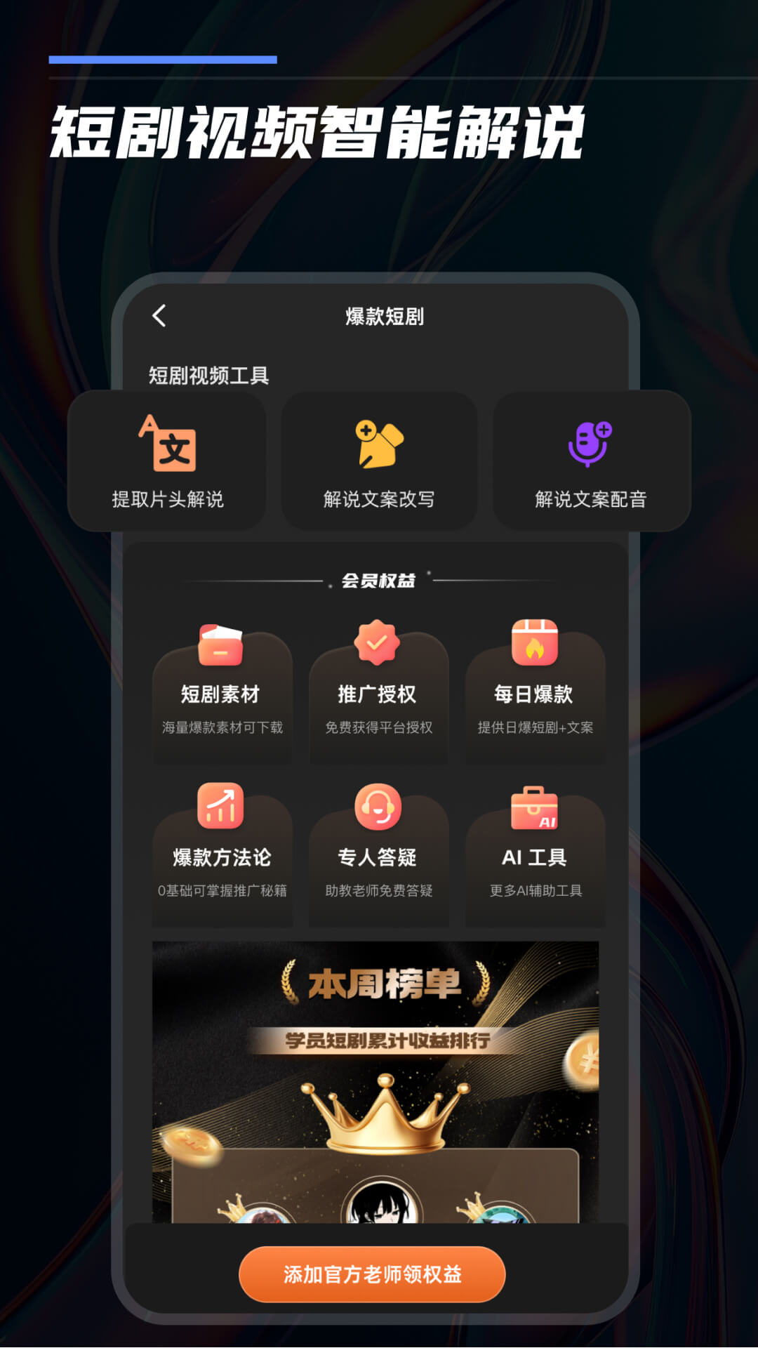 推剧助手是一款服务于短剧二创剪辑与变现的平台,我们帮助用户解决短剧推广授权难,剪辑难,变现难等问题,利用AI技术一键去重自动生成短剧解说视频;帮助“小白”创作者实现在短视频领域发展副业的想法。<br><br>短剧变现:精选高佣短剧平台,免费授权,超多热门短剧项目供你选择。<br><br>智能算法去重:导入原视频,设置去重参数,一键生成高原创度的短剧二创视频。<br><br>一键生成短剧解说视频:导入原视频,一键成片,将原本几个小时的剪辑过程,缩短到几分钟,提高创作效率<br><br>剪辑工具箱:视频拼接、水印处理、文案提取、字幕去除等等实用功能,总有一款是您需要的。