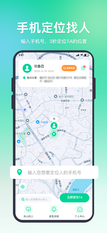 手机定位,找人助手,通过手机号定位找人,查看他的轨迹, 守护他的安全 实时手机定位,输入手机号码定位,即可定位跟踪,历史行动轨迹 查岗神器,一键求助电话定位,手机号定位实时找人软件,定位用于功能均可应对紧急事件发生 运用科学守护原则,贴心守护家人朋友的安全,可用于夫妻定位,情侣定位,家人定位~ 【主要功能】 1,手机定位:手机号码定位,实时定位追踪定位找人 2,一键求助:电话定位,一键向家人发出求助信息 3,历史轨迹:应对突发事件,查看异常行动轨迹定位找人 【使用场景】 1,情侣定位:情侣间共享位置,关系更亲密 2,夫妻定位:实时定位追踪,制造生活小惊喜 3,家人定位:添加孩子位置,轻松防走失,关注父母轨迹,保障父母安全