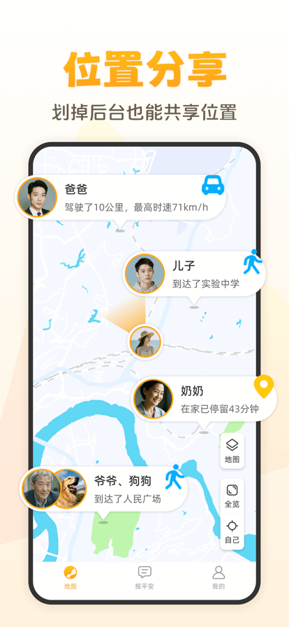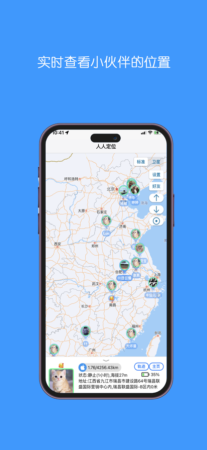人人定位APP所有功能免费使用 主要功能-- 实时位置查看:实时更新亲友的当前位置,家人出行无忧,不怕走失找不到。 历史轨迹回放:随时回放出行轨迹,行程记录最长保存 1 年。 手机状态监控:实时看手机电量、WIFI名称、充电状态、速度、静止时长、卫星信号、海拔等信息。 电子围栏:地图上设置围栏区域,当关注的亲友进入或者离开围栏立刻收到通知。 停留统计:详细记录每日停留地点与时间,报表展示一目了然。 亲友管理:可添加多位亲友,实时掌握他们的动态位置。 高清地图切换:支持卫星地图与街道地图自由切换,城市或山区位置清晰可见。 每日里程统计:自动统计每日运动里程,以日历形式直观呈现。 智能省电:只有2M大小,后台静默运行,智能省电模式,静止耗电量0%。 国际化:国际化多国语言支持。 应用场景-- 家庭守护:夫妻间互相共享位置,随时查看孩子或老人的行踪,防止走失。 出行记录:徒步、骑行、旅行轨迹完整保存,留下珍贵记忆。 企业管理:外勤员工出差轨迹清晰可见,便于考勤与工作监督。 车队出行:车队组队方便互相共享位置实时查看情况。