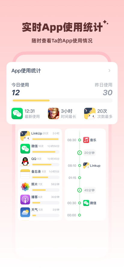 在 LinkUp,情侣密友亲密连接,实时报备位置轨迹,共享手机使用记录,让彼此联系更紧密,守护更安心! —— 核心功能 —— 【查看Ta的实时位置】 无论和Ta相隔多远,都能实时查看彼此距离、对方位置和运动状态,一起共享不孤单~ 【历史轨迹回看】 全天候追踪Ta的行程足迹和出行方式,速度与停留时间尽在掌握,可查询最近15天记录,让关心和守护时刻在线~ 【详细手机使用报告】 全时段get对方的手机屏幕使用时长、解锁次数以及相关APP使用记录,互相监督健康用机! 【实时共享手机状态】 共享手机状态,对方的网络状态/流量使用/当前电量/手机存储等设备信息,每天干啥全知道~ 【敏感记录自动报备】 好友关定位、换手机、网络变更、电量告急?7类事件28种操作任意查看,让安全感爆满~ 【通话记录自动统计】 捕捉Ta的每一次来电和去电记录,自动统计每日通话次数和通话时长! 【一键锁定好友手机】 随时锁定Ta的手机,不回消息或惹你生气时给Ta手机“按下暂停键”~ 【实时语音随时播放】 多种趣味语音任你选择,即使Ta的手机处于锁屏也能立即播放你的语音消息 【水印相机定格瞬间】 一键水印,双摄像头拍照新体验,时间戳+地点标记,捕捉最真实的照片。 【四象限共享协作】 高效记录生活,四个“象限”帮你整理,不再浪费时光,和Ta一起记得重要的事情。 【亲密好友无限添加】 情侣密友亲人同时用,拉近彼此距离,共享生活点滴! —— 温馨提示 —— 定位轨迹设备信息等共享功能需双方同意才可使用哦。 定位轨迹共享会持续使用GPS定位服务,切换至后台仍然会保持GPS连接,相比其它操作会消耗更多的电量,会影响电池续航时间。 —— 自动订阅服务说明 —— • 订阅选项:1个月订阅38元、3 个月订阅68元、12 个月订阅128元 • 付款将在确认购买时从iTunes帐户中扣除。 • 除非在当前订阅期结束前至少 24 小时关闭自动续订,否则订阅将自动续订。 • 账户将在当前期间结束前 24 小时内收取续订费用。 • 订阅可以由用户管理,购买后可以通过转到用户的帐户设置来关闭自动续订。 用户协议:https://link.tttick.com/business/protocol/user.html 隐私政策:https://link.tttick.com/business/protocol/privacy.html