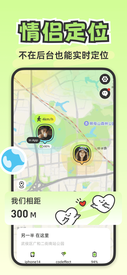 情侣我和你,第一款专为情侣约会设计的手机定位软件 也是全球首款支持到达/离开位置范围提醒的情侣软件 专为2亿情侣精心打造 只要双方都安装了该情侣软件,随时随地,了解另一伴的位置。约会时不用再问:“到哪了?”,免去你的牵挂。 =>位置距离 只要情侣双方都安装了该应用,随时随地,了解另一伴的位置和距离。情侣约会时不用再问:“到哪了?”,免去你的牵挂。 =>定位精准 针对中国地图,进行位置纠偏,100%精准。 =>位置聊天 情侣间一对一基于地图位置的亲密聊天,传达甜蜜。 =>语音视频 情侣间一对一的语音聊天和视频聊天,沟通简单看得见。 =>后台定位 另一伴手机只要打开过情侣我和你,关闭后,应用处于后台模式时,也能知道其所在位置。 =>一键定位导航 点击另一伴头像,定位TA的位置,实时传送,支持百度和高德导航。 =>情侣日记 留住你我间的美好回忆。 =>情侣相册 专属两人的私密相册。 =>情侣同屏看片 异地恋一起同屏看片,就喜欢在一起的感觉。 =>多网络支持 支持GPS,3G,WIFI,GPRS多种网络,多种形式的手机定位,功能强大。 =>完全免费 情侣我和你完全免费,没有任何广告,保证用户的最佳体验! 可在应用内购买情侣我和你会员 三种方式购买情侣我和你会员 第一种:28元/7天 购买临时会员,并按7天自动续订。 第二种:298元/年 购买年会员,并按年自动续订。 第三种:368元/季度 购买高级会员,3天免费试用,之后按季度自动续订。 购买须知 付款:通过用户的iTunes账户扣款,用户确认购买后即付款. 续订:苹果iTunes账户会在到期前24小时内扣费,扣费成功后订阅周期顺延1个订阅周期. 取消续订:如需取消续订,打开苹果手机"设置"-->进入"iTunes Store与App Store"-->点击"App ID",选择"查看Apple ID",进入"账户设置"页面,点击"订阅",选择取消订阅即可.如未在订阅期结束的至少24小时以前取消订阅,此订阅将会自动续订. 隐私政策(Privacy Agreement):http://static.wohenizaiyiqi.com/others/whn/whn_privacy.html 使用者协议(Terms of Use):http://static.wohenizaiyiqi.com/others/whn/whn_useterm.html 注:应用会在后台持续使用定位功能,这将会降低电池的使用时间(Continued use of GPS running in the background can dramatically decrease battery life.) 您有任何问题或疑虑,欢迎随时与我们联系! 反馈邮箱:help@wohenizaiyiqi.com 情侣我和你将不断进步,提供更多贴心功能。