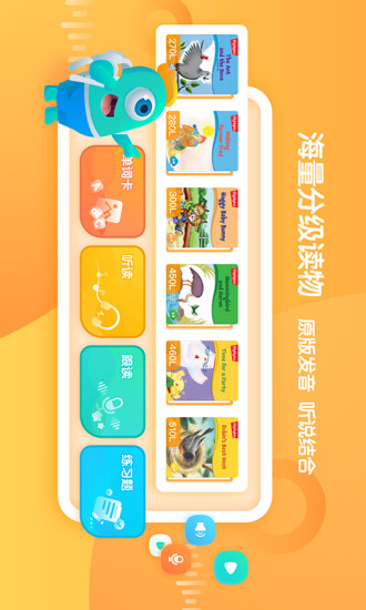 汇聚全球优质原版英文绘本、中文图书,为3-12岁儿童提供线上英文绘本馆、中文图书馆,让孩子听故事磨耳朵读绘本练发音,新时代的中英文双语启蒙。 英语经典绘本、中文趣味故事、睡前故事、童话故事等有趣的故事陪伴孩子,让孩子的童年充满快乐。 精选全球高品质绘本及图书,将其开发为有声读物便于孩子阅读。同时进行科学合理的分级,让不同成长阶段的孩子都能体会到如儿童游戏般的阅读体验。 通过原版绘本、图书分级阅读的方式,对孩子进行中英文双语启蒙教育。 【英文绘本】 -英文分级阅读:根据小朋友的年龄和兴趣,选择适合的阅读内容,解决家长选书困扰。 【中文图书】 - 中文分级阅读:带领孩子从阅读萌芽期到独立阅读期,科学培养孩子阅读习惯。 【阅读方式】 -趣味阅读:在阅读中识字、学单词,提高阅读理解。提高语言表达能力,增强学习兴趣 。 【动画儿歌】 -听儿歌:热门好听的儿歌故事、唐诗宋词等,贴心精选启蒙儿歌快乐磨耳朵,高清好音质更适合家长和小朋友们。