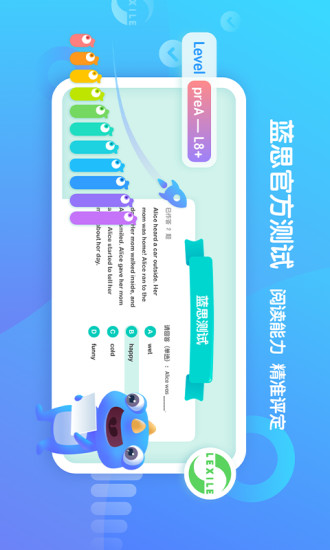 (一)产品功能 国内首家与美国MetaMetrics公司(蓝思测试母公司)共同研发的线上英文分级阅读平台,专注于为中小学生提供专业的英文分级阅读解决方案。 主要功能: 1、通过平台内置的蓝思在线测试,准确评估学生阅读能力,为学生制定个性化英语阅读方案。测试题目不重复,可多次进行,体现阶段进步。 2、提供听读、跟读、语音评测、单词练习、阅读理解题、泛听练习功能,并实时跟踪学生阅读数据, 形成个性化阅读报告和学习建议。 (二)产品特色 海量读物--2000本原版英文分级读物 蓝思测评--在线官方蓝思测试准确评定读者阅读能力 智能打分--智能实时口语评分,提示需练习内容 故事导读—新东方老师进行专业故事导读 泛听磨耳朵 – 故事童谣听力启蒙 (三) 内容体系 依据蓝思测评体系和中国学生二语阅读水平搭建了PreA、PreB、L1-L8共十个阅读级别,帮助孩子一步步实现从“阅读萌芽期”向“独立阅读期”的进阶和飞跃。