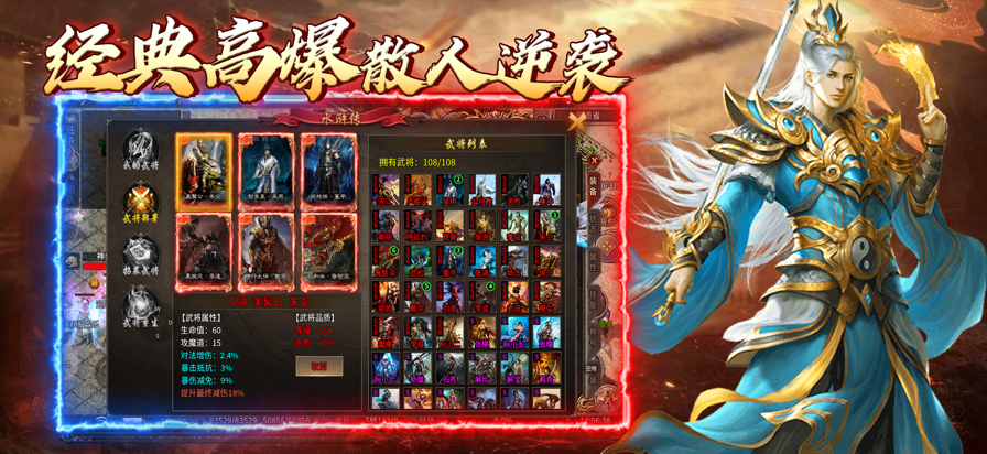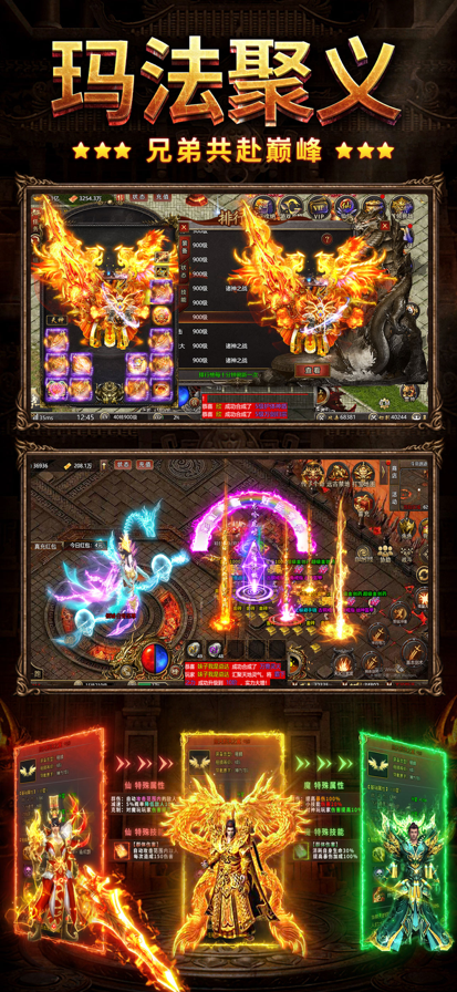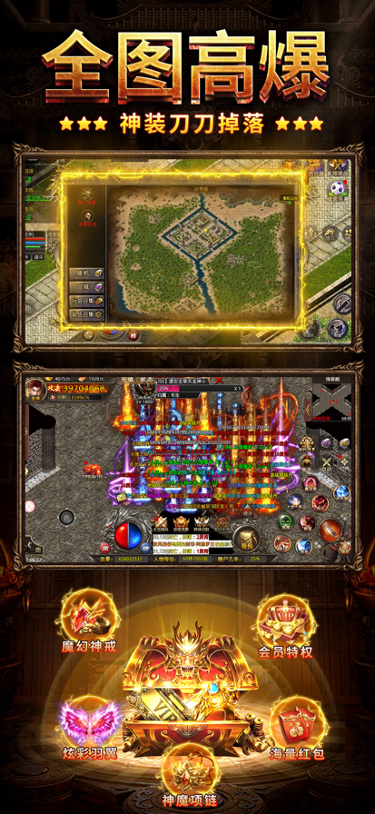 年度重磅复古巨作,全新版本,经典热血!高自由度游玩方式,紧张刺激的副本体验,极品装备收集乐趣,跨服pk,热血团战,散人霸服,爆率全开!原版复刻经典BOSS系统,和兄弟并肩组队打BOSS,体验疯狂收割的乐趣,让你不再为装备和资源发愁!并肩征战,问鼎玛法之巅,快来捍卫你们的热血荣耀!