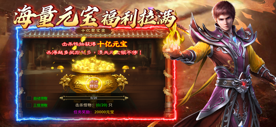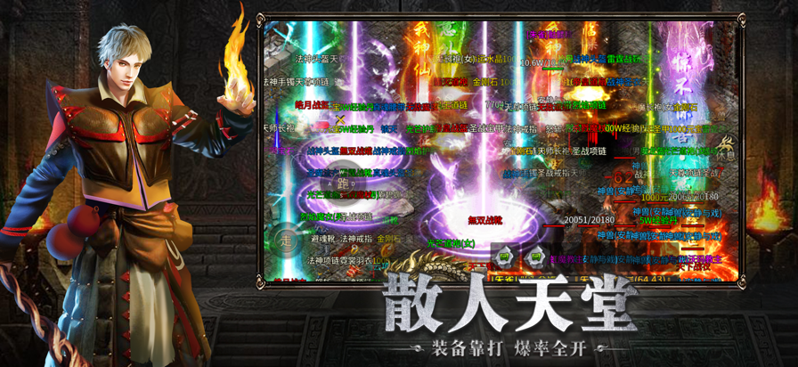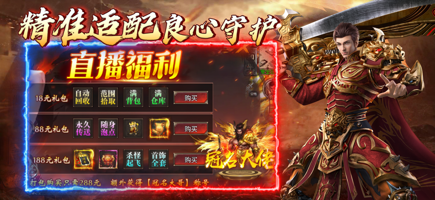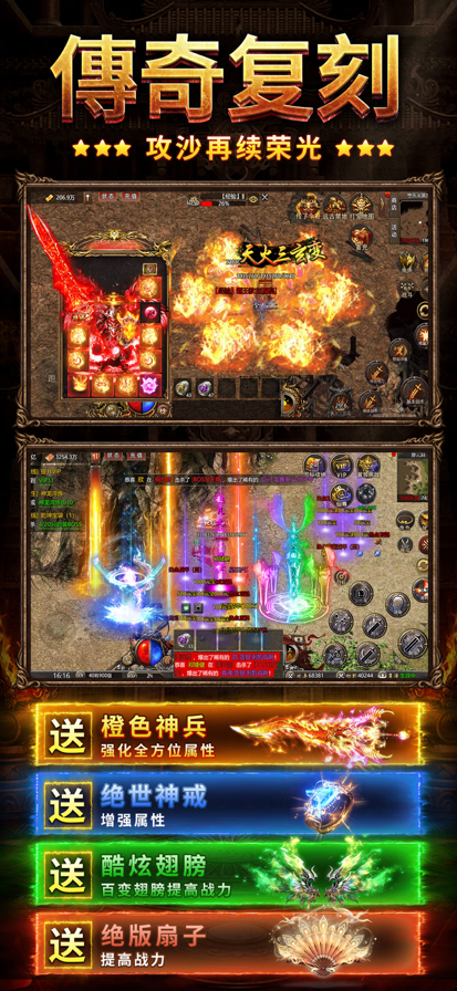 全新传奇大作今日盛大开服,8090后共同青春回忆,正版传奇授权,带你重温当年的热血。现在上线就是100倍攻速,攻速直接拉满,玩的就是刀刀加速,无限切割,满屏光柱1000倍爆率,装备材料任意掉落,无限爆率装备捡不停!装备全靠打,交易自由可回收,打造散人天堂;快和当年的兄弟一起来延续传奇的神话! 玩法介绍: 【攻速拉满 刀刀切割】 上线直接享受100倍攻速,攻速拉满一秒九刀,刀刀带切割;无论是小怪还是BOSS,统统轻松秒杀。 【神装高爆 遍地光柱】 所有副本怪物都有超高1000倍爆率,击杀小怪也有满屏光柱,小怪也能掉极品,装备材料捡个不停。 【自由打本 地图任选】 所有副本关卡不设限制自由选择,配合满攻速高爆率,就可以快速打通高级副本,不断挑战极限,半小时装备就能成型。 【挂机泡点 等级秒升】 通关高级副本后直接在副本自动挂机刷怪,解放双手,不用充值一分钱,轻轻松松玩到满级。 【跨服竞技 自由PK】 万人在线,跨服自由竞技,野外红名、击杀爆装、镖车护送,众多PVP玩法,到底谁能成为全服最强? 【热血攻沙 谁与争锋】 最让兄弟们期待,热血沸腾的攻沙玩法来了,公会兄弟一起排兵布阵相互配合,热血攻沙,公会之间相互对抗,捍卫公会荣耀。 【装备合成 交易回收】 所有装备可以自由合成,低级装备也能合出神装;装备素材还可以随时随地进行自由交易或者回收,简直就是散人天堂。