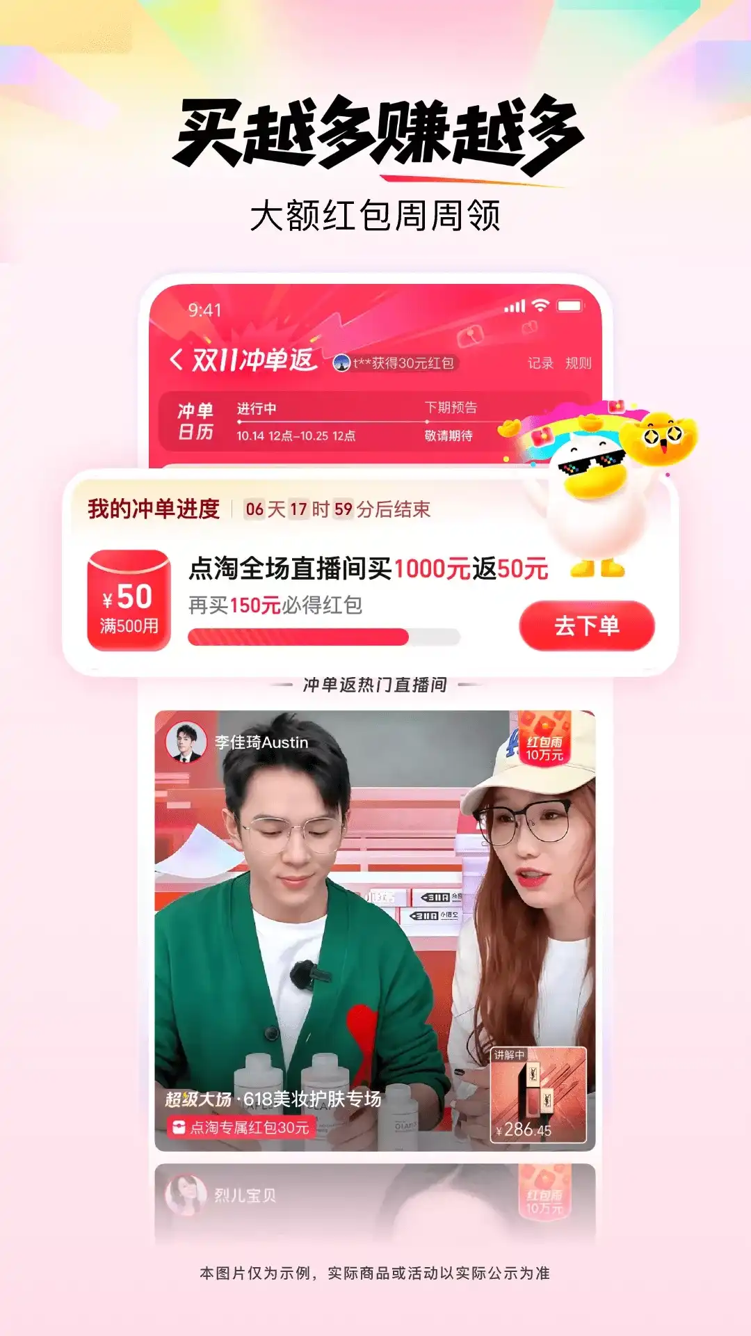点淘APP,追剧剁手党一定不能错过的宝藏app,超多主播达人推荐良心好物、分享生活攻略,一起涨姿势、添满美好buff。直播间红包雨优惠券加持,大牌秒杀,折上折更优惠,从此告别购物犹豫不决。 汇聚超多热门短剧,甜宠现言、古装重生、仙侠玄幻等多种题材应有尽有,轻松找到心仪的剧集,高清画质无广告干扰,观影体验更加畅快! 【爆款短剧,随时畅享】短剧爱好者的天堂,涵盖海量爆款短剧,题材丰富,制作精良,再也不用担心剧荒啦! 【直播开启新世界,淘好物逛不停】 亿万网民的选货达人汇集于此,为你甄选更优质的商品,为你提供更优惠的价格,还有明星空降直播间,万千主播总有你的pick。开蚌、开翡翠原石、撸猫遛狗,打开奇奇怪怪可可爱爱的新世界大门,新奇有趣近在眼前。 【趋势热榜榜单,走在流行前沿】 又火又潮又时尚,尽在趋势热榜。吃喝玩乐、穿搭美妆,一手新鲜话题让你成为时尚弄潮儿、冲浪小能手。 【挚爱粉集聚地,给你喜爱的主播打call】 亲密度翻倍,助力值翻倍,快速升级挚爱粉,帮助主播冲榜升级。疼爱你的主播,就用点淘APP。