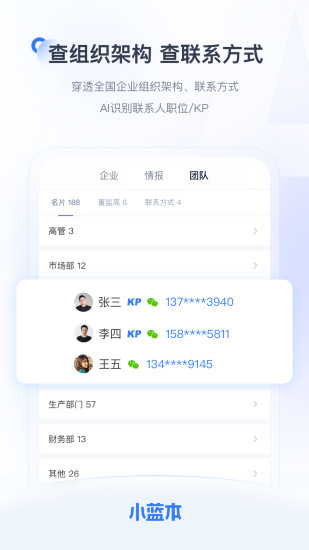 小蓝本是一款帮助销售人员快速获客的工具。穿透全网企业公开数据与组织人员架构,由专家打造细分行业的客户筛选画像,实现销售一键定位目标客户,精准触达人脉的诉求。 组织架构:汇聚商业社交人脉,AI算法识别企业内部部门、职位、是否为关键决策人。 客户筛选器:搜索客户时使用以复杂条件定制的行业筛选器,一键定位您的目标客户。 人脉图谱:查多个人物与公司之间的关系,挖掘可为你引荐目标企业或人物的相关人脉。 求职检测:查询招聘企业是否存在税收违法、经营异常、失信信息等风险、是否发生过劳动纠纷,以及公司实力和发展前景,帮助求职者规避求职陷阱和风险。