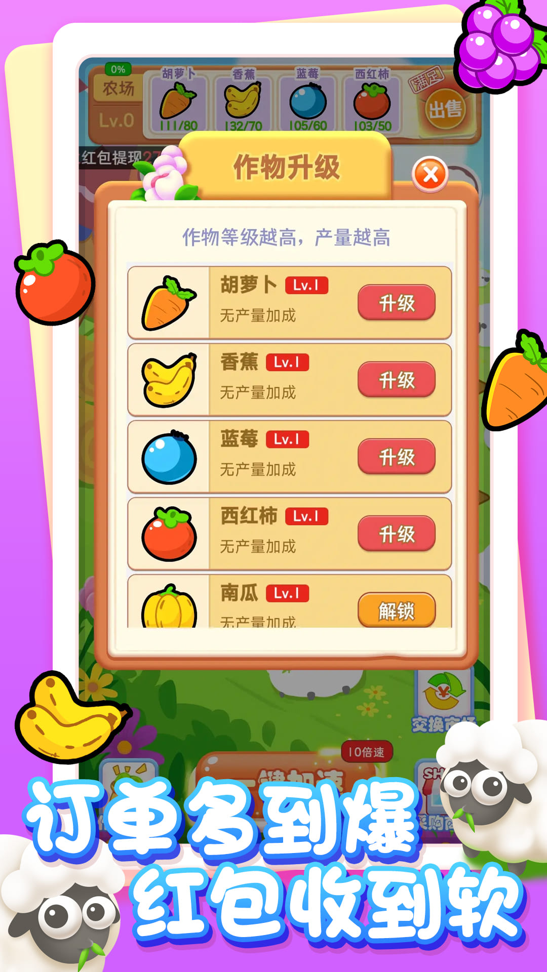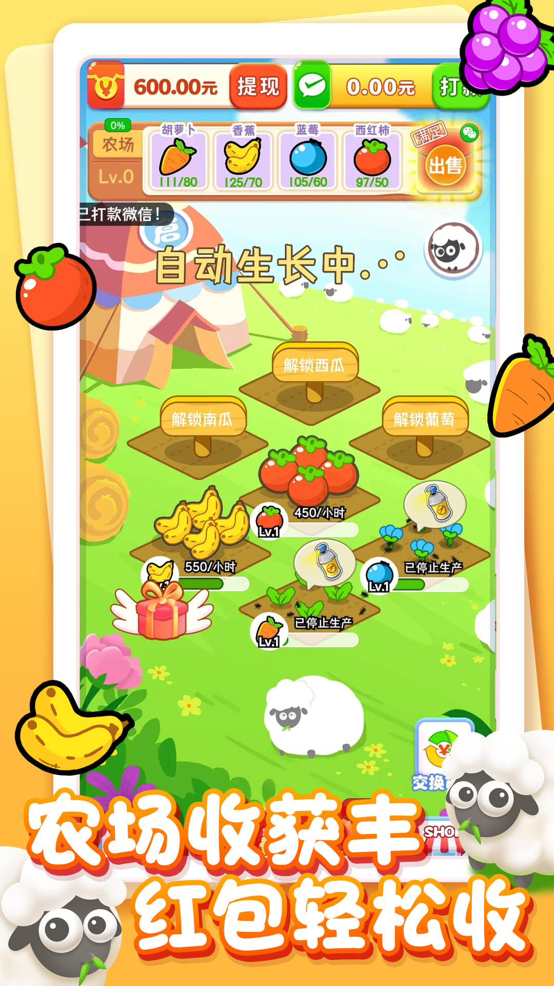 欢迎来悠然农场!在农场通过种植收获农作物用于换取农场订单红包,红包可以兑换现金!游戏中有着舒适的画面,活灵活现的人物,各种突发事件,呈现出一个真实而丰富的农场世界。 【赚钱多】完成订单换取红包,红包兑换现金,订单无限,红包无限。 【提现快】红包可提现,还有直接打款功能点,福利多多。 【易操作】游戏提供快捷种植操作,玩家点一点就能赚取红包。