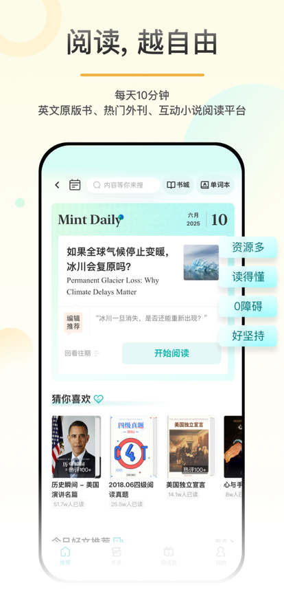 每天给我 10 分钟,英语阅读超轻松! 百词斩旗下超轻量英文阅读软件,我有一百种方式让你爱上阅读。 考试提分?开拓眼界?增加阅历?沉浸英文环境? Let us rock Reading! -海量阅读材料 外刊短篇原版书,童话小说社科文,你喜欢的我都有 -阅读工具 音频、查词、笔记、翻译,一个页面,应有尽有 -难度自选 从初中水平到专业英语,多档难度自由选择,强力算法针对每一位大侠,选出最适合的等级 -互动小说 沉浸式英文互动阅读,比小说更上头,比原著更易读 -阅读日历 嘿,听说你又.…忘记读了?不要紧,在这里,给自己定个flag -全方位服务 任何时候在使用过程中遇到了问题,或者一个闪光的火花,应用内、微博上,斩护卫都等着你,没错,是真人!!