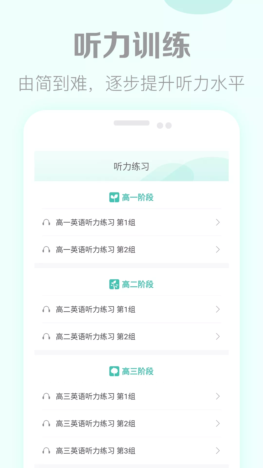 高考英语听力专项训练。 每套听力试题都有高清的配音,全真模拟考试流程,智能答题检测系统。听力文稿一一对应,随时查看。所有试题都针对手机屏幕进行了精心的排版,听题答题更舒适。 (1)听力训练。近80套训练试题,从高一阶段到高三阶段,由简到难,循序渐进,逐步提升听力水平。 (2)听力模拟。100套高考模拟试题,试题类型、试题难度等,都与高考相近。 (3)听力真题。历年全国各地高考听力真题汇编,实战演练。 (4)听力学习。听力日常学习和答题技巧等。 (5)听力词汇。听力考试中,出现的高频词汇归纳。 (6)听读美文。100篇经典英语美文诵读,保持英语听力环境。 (7)其他功能说明。题目点读功能、字体大小和样式设置、夜间模式等,让学习更方便。 APP备案编号:湘ICP备16009959号-4A
