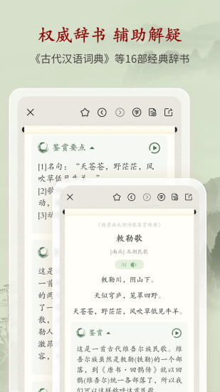 【主要特色】 1、古诗文、古籍特别全,分类详细 2、注释翻译解析质量沉实,有拼音批注方便查看,还有朗读 3、内容权威,文献证明,内嵌字典,赏析到位 4、界面简洁清新很有代入感 5、功能实用快捷、浏览丝滑方便,分屏便捷,搜索迅速,引导合理 【学生党必备】 古文带拼音+真人朗读,文言文突击神器 中高考高频考点诗词一键收藏,支持下载 【文艺爱好者专属】 每日推送,AI算法匹配你的审美偏好 边听名家朗诵《将进酒》,边看互动注释解析 【学术研究利器】 收录100万+文献资料,含《四库全书》 智能对比不同版本注释,文献溯源权威 四大核心竞争力 ① 最全文库:覆盖先秦至明清2万+作者作品 ② 精准解析:附【创作背景】【文言语法】【典故溯源】三维解读 ③ 交互黑科技:分屏对照(原文/译文/注释/赏析/拼音自由组合) ④ 零干扰体验:沉浸式阅读