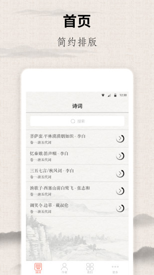 唐诗宋词古文大全:这是一款学习唐诗三百首、宋词三百首、元曲三百首、小学诗词、初中诗词、高中诗词的古诗词软件,不但适合中小学生学习古诗词使用:每日背诵一首古诗词,查询各类古诗词诗句,还可以根据诗人进行分类查找;同时还提供适合儿童早教启蒙的三字经、论语、史记等内容、,让孩子从小接受传统文化的熏陶,传承中华民族传统文化。 【古诗词】收录唐诗三百收、宋词三百首、元曲三百首,海量的诗词作品适合儿童早教和中小学生学习诗词使用,让孩子从小学习古诗词,积累诗句,培养孩子引经据典出口成章。 【推荐诗人】收录李白、白居易、苏轼、杜甫、辛弃疾等著名诗人的诗句及诗人生平介绍,您可以根据诗人进行查看所有的诗词。 【每日一诗】每天推荐一首古诗词,养成每天背诵一首古诗词的习惯,不断积累提高古诗词的鉴赏能力,感受古诗词的韵味。 【儿童早教】论语、三字经、史记、经典小故事,睡前听一听,让孩子在传统文化的熏陶下传承传统文化。 【搜索查找】搜索查找,根据作者、诗词名字等关键字搜索查找古诗词详细信息