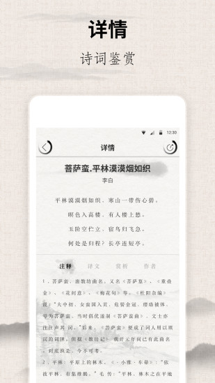 中国古诗词典唐诗宋词鉴赏学习,学习中华传统文化、中国古诗词、唐诗三百首、宋词、文言文,赏中华诗词,品生活之美。精选中国唐诗、宋词、古文,为你提供一个干净清新的欣赏空间。有大江东去的豪放明快,有低头弄梅的婉媚曲折,也有西窗烛的情深意重,诗词之美,时光洗练。 【诗词文库】五千年中华文化,100万诗词文库,按朝代、作者、作品分类搜索,涵盖注释、译文和赏析。 【精选分类】对100万诗词进行分类,包括:主题、情怀、分类、节日、风景、休闲等 【配套教材】与人教版、苏教版等教材配合使用,让学习和课程结合,查看课程诗词更省时间,还可以为您智能安排学习和复习,适合孩子进行中国古诗词的学习,轻松学习故事三百首,感受中国国学文化。 【诗词作者】孔子、老子、孟子、庄子、苏轼、李白、陆游、王维、杜甫、杜牧、屈原、柳永、李煜、李商隐、辛弃疾、李清照、白居易、陶渊明、温庭筠、欧阳修、晏几道、刘禹锡、孟浩然等。 【经典文集】唐诗三百首、宋词三百首、元曲三百首、诗经、乐府、千家诗、古诗十九首、道德经、周易、论语等。 【学习计划】你可以设置经典诗词、文库分类和诗单收藏变成自己的学习计划,每天有计划的打卡学习。 【诗词朗诵】窗外雨打芭蕉,陪你挑灯读诗。用家乡话读、陪着孩子读、学古人吟诵、配乐朗诵、为你读诗。 【诗词挑战】诗词大会、飞花令和诗词接龙,累计有百万人次参加,诗词在富有趣味性和竞技性的游戏过程中焕发新的魅力。 -儒雅大气的中国风设计: 诗词的设计是对中华传统文化的回归,铿锵有力的华文中宋字体,黑白夜间切换的禅意配图,精心打磨的古风窗棂设计,让你置身于如画般的诗意。 古典文化,现代传承。