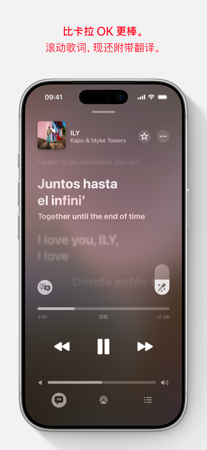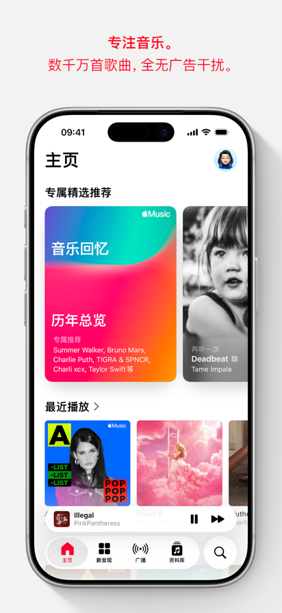 Apple Music 专注于音乐,提供高质量音频及富有深度的独家内容。全程无广告,让你以前所未有的方式与喜爱的艺人同频共振。 • 无限畅享超 1 亿首歌曲。 • 播放列表与电台为你量身定制。在主页查找探索电台、个性化精选推荐和混音等。 • 精确的逐拍歌词现已包括许多你喜爱歌曲的翻译和发音,让你自信跟唱无压力。(1) • “自动过渡”让聆听体验更上层楼。“自动过渡”可像 DJ 一样无缝切换歌曲。 • 通过空间音频 (2) 和无损音频 (3) 享受更优音质。 • 通过深入采访、现场演出和音乐界最具标志性人物创建的独家广播节目,进一步了解你喜爱的艺人。这些内容均为 Apple Music 独家专供。 • 查找所在地区的演唱会和喜爱艺人的巡演排期。 • “自动连播”可持续播放音乐,聆听体验不间断。 • 通过 Apple Music 唱歌,降低人声音量,跟唱喜爱的歌曲。现在,你可以将 iPhone 与 Apple TV 配对,把 iPhone 用作麦克风。这体验,比卡拉 OK 更胜一筹。 • 使用同播共享实时与朋友一起听音乐,还可在车内一起控制音乐。 • 分享你喜爱的音乐。邀请朋友协作编辑播放列表,(4) 通过同播共享参加音乐欣赏会,甚至还可在“信息”中分享感人至深的歌词。 • 下载你喜爱的音乐,并离线聆听。 • 按歌词搜索歌曲,或询问 Siri。 • 使用 CarPlay 车载带着所有美好体验出发,使用车载控制即可搜索音乐。 Apple Watch 功能: • 直接下载音乐并流传输至 Apple Watch。 • 使用随手写和听写搜索音乐。 • 使用主页快速返回最近播放、推荐电台、精选推荐等。 • 直接从腕间按个人偏好为喜爱的播放列表、专辑和歌曲排序。 1. “歌词翻译”和“歌词发音”适用于部分语言和文字的部分歌曲。 2. 需要兼容的硬件和软件。并非所有内容均可用支持杜比全景声的空间音频播放。 3. 无损音频最高可达 24 位/192 kHz。高解析度无损音频需要外接设备,如 USB 数模转换器。 4. 未满 13 岁的用户无法协作处理播放列表,因为他们无法在“音乐”中创建身份。喀麦隆、中国大陆、马拉维、马里、俄罗斯、土耳其、阿拉伯联合酋长国和乌拉圭的用户无法进行协作。 可用性和功能因国家和地区、计划或设备而异。若要获取最新功能,请确保设备运行最新软件版本。订阅会自动续期,除非在当前周期结束前至少 24 小时取消。你的账户将在当前周期结束前 24 小时内被扣款续订。购买后,你可以在“设置”中管理或取消订阅。Apple 媒体服务条款和条件请参阅:https://www.apple.com.cn/legal/internet-services/itunes/cn/terms.html。