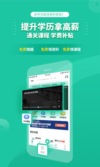 成人高考,考生福利来啦~~ 你想快速通过成人高考入学考试吗? 2022年高达专、高达本、专升本历届考试真题全新上线。 高起专成人高考、高起本成人高考、专升本覆盖全国20多个省市,千所合作继续教育考试院专业,铸就学历提升。 【免费直播公开课】 形成科学的方式,教、学,练,问,一套完整解决方案。让你掌握高效学习方法助力考试。 必考知识点,考试须知,历年真题讲解,想过成人高考———坚持每天上直播。 【成考新版免费视频】 同步成人高考国家权威考试大纲,按章节系统学习,360度无死角学些,国家正规考试教材。 高清视频,支持离线下载,清晰度选择,给学员提供免费体验的视频观看,别人每天赶着去上课。 在家里、在公司、在公交、在地铁...,为学员提供随时随地做题。 【成人高考考试题库历年真题】 章节练习,配合免费视频,一起学习,看完视频,刷刷题。 真题模考,全面检测自己的不足之处,有针对性的再次练习。 学习报告,统计每天正确率,学习时长估算你的考试分数高准率。