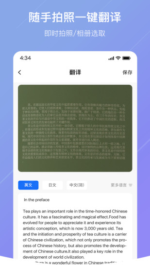 扫描拍照翻译是一款能够扫描图标直接翻译的APP!还能自动扫描图片并转换其中的文字! 它能够读取相机或者相册中的图片,由您指定识别区域,然后自动转换为文字。人性化的功能为您的生活带来了许多便利,出国旅游语言不通扫一扫;想把图片上的文字提取出来扫一扫;相册识字扫一扫! 支持的功能有: 1. 文字转换,图文转换 2. 拍照翻译,文字翻译 3. 文字提取,识图取字 4. 相册识字,相册扫描 扫描拍照翻译集成了百度翻译、谷歌翻译、有道翻译及微软翻译等多种翻译平台,能够提供给你多种翻译结果对比参考,并且集成了先进的语音识别技术和图片识别技术,能有效提高您的翻译效率,是您工作、生活、学习、旅游等的必备翻译神器。 扫描拍照翻译能够极大提高您的输入效率,快来使用吧!