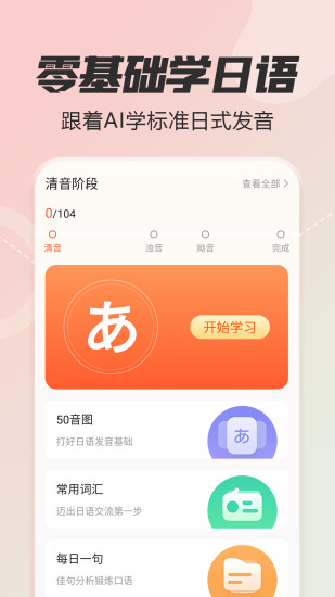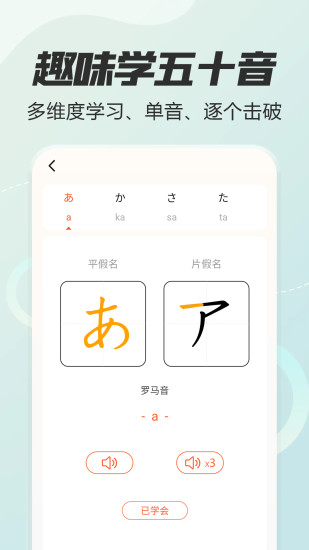 米娜桑~ 再也不用害怕从零开始自学日语啦! 日语五十音图APP,就像是为日语零基础小白量身打造的魔法门,让您轻松跨入日语的奇妙世界!" ——功能特色—— 【学习日语】 丰富多彩的学习卡片:日语听、说、读、写,全方位掌握日语。 真人发音:原汁原味的日语发音,助您准备去日本旅游留学、无障碍看日剧动漫、日语考级、日语考研一步步打下坚实基础。 手写日语:学习日语五十音图基础,轻松应对日语书写。 专业视频教程:深入探讨日语发音口型技巧,让您日语发音更地道。 闯关模式:合理规划学习进度,夯实日语基础。 【日语测验】 假名测试:使用日语配套题库,巩固您的日语学习。 阶段测验:评估您日语学习成果。 【知识拓展】 知识圈学习:不定期更新各种日语干货,提供日语入门学习技巧、日语学习难点突破秘籍、更有趣味日语电台丰富日语知识。让您的日语学习更上一层楼!
