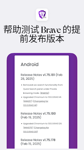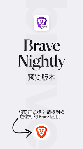<b>新应用功能</b><br>✓ 防火墙。 保护您的一切网络活动,即使在 Brave 浏览器之外也不例外。<br>✓ VPN。 在手机和电脑上均适用。<br> <br><0>帮助测试 Brave 的提前发布版本<br>✓ 帮助识别和处理漏洞<br>✓ 在正式发布前提前试用新功能<br> <br>访问 https://brave.com/msupport 提供测试版反馈<br> <br>同时安装并运行 Android 版的 Brave Nightly 版和 Brave 正式版。