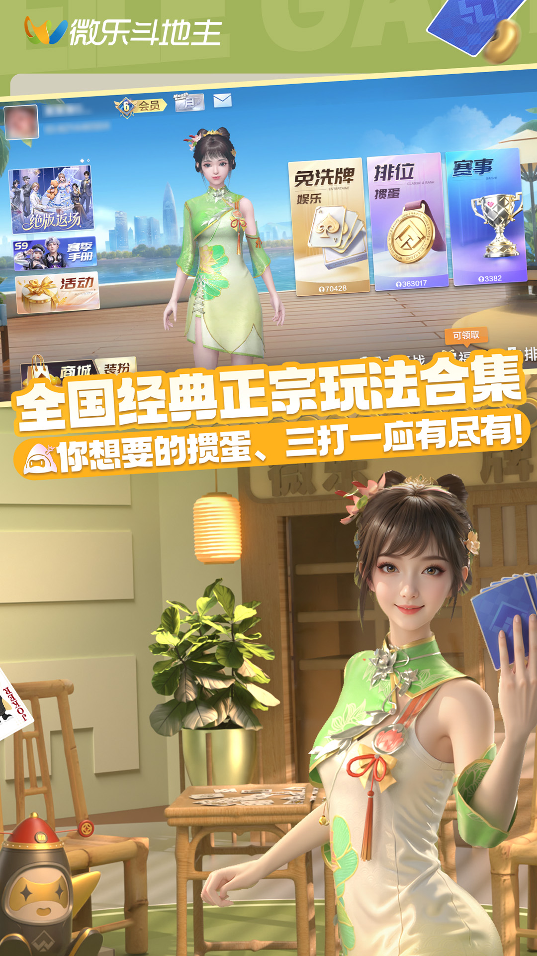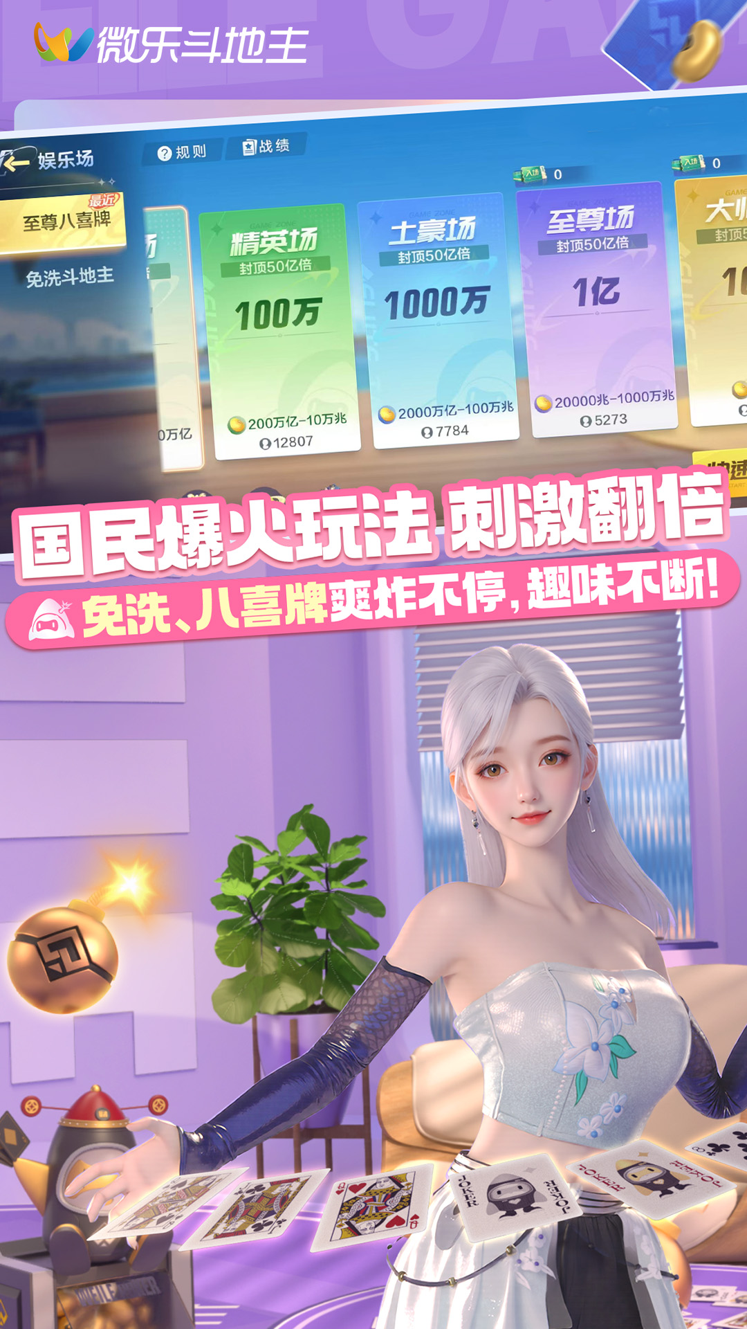 《微乐斗地主》是一款全国经典正宗扑克玩法合集手游!国民爆火玩法炸翻全场,专业赛事牌技为王,超人气主播都在玩!更有精美时装百变登场,海量福利狂送不停!<br><br>【全国经典正宗玩法合集】<br>你想要的斗地主、掼蛋、三打一、刨幺、跑得快、够级、锄大地、五十K……在这里应有尽有!<br><br>【国民爆火玩法 刺激翻倍】<br>娱乐玩法“免洗斗地主”、“至尊八喜牌”,畅快胡牌、爽炸不停,趣味不断!<br><br>【专业赛事不断 牌技为王】<br>公平竞技,秀出实力,以牌技拼出胜利!更有千亿豆、挑战奖励等海量福利狂送!<br><br>【超人气主播力荐 等你来】<br>千万粉丝主播旭旭宝宝和超多人气主播都在玩,快来与主播同台竞技,一决高下!<br><br>【免费考级 拿IMSA权威认证证书】<br>实战即可免费获得IMSA世界牌类竞技联盟认证证书,国际权威认证,唯一编码全球可查!<br><br>【海量精美时装 百变登场】<br>百款服饰任意搭配,璀璨、典藏服饰焕然一新,时尚你说的算!