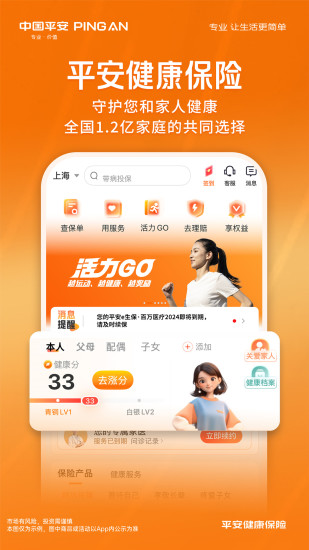 平安健康保险APP是中国平安集团平安健康保险股份有限公司官方APP。作为集保险保障、就医服务、健康管理为一体的健康守护平台,平安健康保险APP5.0全新升级,并推出“乐健康”会员权益及激励体系,为用户提供优质健康内容、海量会员权益、专属管家服务,陪伴我们的用户养成健康生活方式,守护亿万家庭健康! 【关于平安健康保险】 平安健康保险股份有限公司作为我国首批设立的专业健康保险公司,于2005年成立,总部设立在上海,是"世界500强"企业——中国平安保险(集团)股份有限公司的重要成员公司。平安健康保险致力于为用户提供"省心、省时、又省钱"的一站式健康解决方案,创新性推出就医理赔一体化服务模式,拥有100+款高特色的保险产品,为用户带来“主动的全流程诊疗陪伴”,是全国1.2亿家庭的共同选择。 【健康商城】 为您精选家庭保障,医疗、重疾、意外险与健康服务。覆盖您和家人的每一个健康需求。 为您提供在线查找平安健康保险全球合作医疗网络、健康咨询、健康管理服务,让您看病从此不再焦虑! 为您提供健康好物,覆盖您的衣食住行,360°守护您的健康生活! 【活力GO】 活力GO通过“科学健康任务+多重奖励