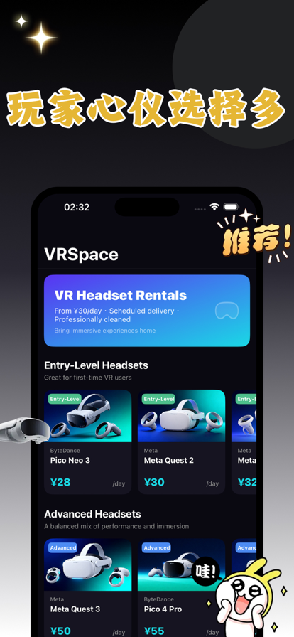 Step into VR with less setup and more confidence. VRSpace helps you browse rental-ready VR headsets, compare device tiers, add optional experience services, and place rental orders in one smooth flow. Whether you are planning a solo session, a party setup, or a premium story night, VRSpace brings hardware discovery, ordering, and community sharing together in one app.