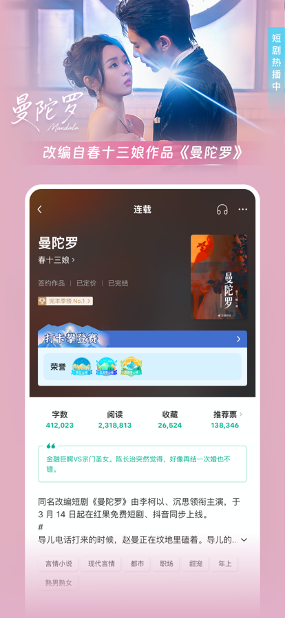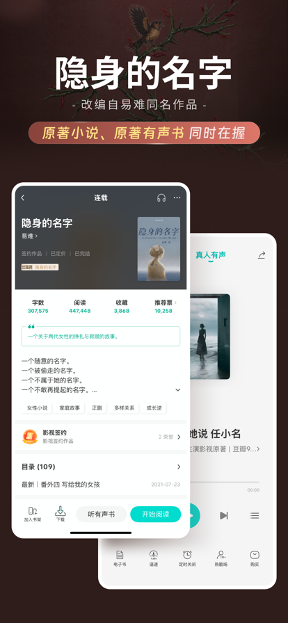 豆瓣,你的书影音世界。 豆瓣阅读,你的小说世界。 豆瓣阅读是豆瓣旗下的优质类型小说平台。 我们主打悬疑、女性、幻想、文艺、历史等类型,强调文学性和流行性的结合,打造「看的时候停不下来,看过之后回味再三」的精品小说。 豆瓣阅读是一个活跃的创作者与读者交流的社区。在这里,可以与更多豆瓣好友进行深入的讨论与交流。对喜欢的作品和作者,可以关注、订阅、评论、送花。 在豆瓣阅读里,你可以—— 读到优质小说 • 悬疑、女性、幻想、文艺、历史五大频道,拥有豆瓣评分 8.0 以上的优质小说,经过豆瓣读者数据检验。 • 绝对原创,每月新作 9000+,超过半数作品免费阅读。来自当下最优秀的青年创作者。 • 近 10 万种经过精细排版的正版电子图书,包括中信、读客、果麦、磨铁等多家著名出版社。 订阅作者长篇连载 • 订阅:专栏和连载有更新,第一时间提醒。 • 送花:给你爱的作品送花,帮助它成为花神。 • 批注:可以对书中的任何一个细节进行批注。豆瓣阅读每月新增批注 60000+,读到书友们令人叫绝的批注,是使用豆瓣阅读特有的乐趣。 • 评论:在豆瓣阅读评论,可以得到作者第一时间的回复。豆瓣阅读每月新增评论 15000+,作者与读者之间碰撞出的思维火花,和小说本身一样好看。 • 赠书:支持送书给朋友,可一对一赠送,也可以一次购买多本送给多个朋友,还可以写赠言。 找到你想读的电子书 • 按热门程度、按更新字数、按好评程度……各种榜单实时更新,帮助选出最好看的作品。 • 按作品分类、按价格区间、按热门程度、按发表时间……多种作品筛选和排序方法,帮助选出最想看的作品。 • 个性化小说推荐,猜中你的喜好;编辑精选主题书单,提供最专业的选书视角。 享受细腻的阅读体验 • 精致的书籍内容排版,最优美的细节呈现,支持在阅读中批注、划线、添加书签,免费试读所有作品,可下载作品到本地,随时离线阅读。 • 已购作品、阅读进度、书签、笔记等可在多个设备间实时同步。 成为作者,来写作和发表第一部作品 • 开放写作平台:原创作品自出版平台,开放接受投稿(请在电脑上访问 https://read.douban.com/submit/ ),为作品提供在线售卖、运营和推广服务。 • 版权运营:为作品提供可信赖的版权运营服务,包括影视改编、纸书出版等版权业务。已有多部原创作品成功售出影视改编权,涵盖女性、职场、都市、悬疑、幻想等多个题材。已经将近百本纸质书陆续出版。 • 征文大赛:连续主办六届的大型赛事,分组别竞赛,职场爱情、生活悬疑、幻想小说、文艺小说等每组都选出青年获奖作者。已经成为国内青年作者最重要的出道比赛。 更多精彩 • 精彩原创:《装腔启示录》、《雪盲》、《双宿时代》、《天下刀宗》、《小敏家》、《贤媛》、《滚尘》、《美人余》、《她和她的群岛》、《盘锦豹子》、《欢迎光临兔子直播间》、《这里没有善男信女》、《孤独实验室》、《找到她》、《差一点少女》、《海葵》。 • 畅销佳作:《月亮与六便士》、《流浪地球》、《哈利波特》、《拉普拉斯的魔女》、《无人生还》、《飘》、《基督山伯爵》、《危险的维纳斯》、《活着》、《古董局中局》、《原来你也在这里》。 • 好评作者:东野圭吾、J·K·罗琳、刘慈欣、阿加莎·克里斯蒂、马伯庸、紫金陈、顾漫、八月长安、阿耐、刘玥、叶小辛、易难、翼走、双翅目、郭沛文、伊北、王平常。 • 言情、女性、悬疑、推理、科幻、幻想、青春、都市、文艺等众多分类书籍等你发现。 使用条款 会员订阅服务协议:https://read.douban.com/membership/subscription 自动续费协议:https://read.douban.com/membership/auto_renewable 豆瓣使用协议:https://www.douban.com/about/agreement 豆瓣阅读隐私政策:https://read.douban.com/privacy