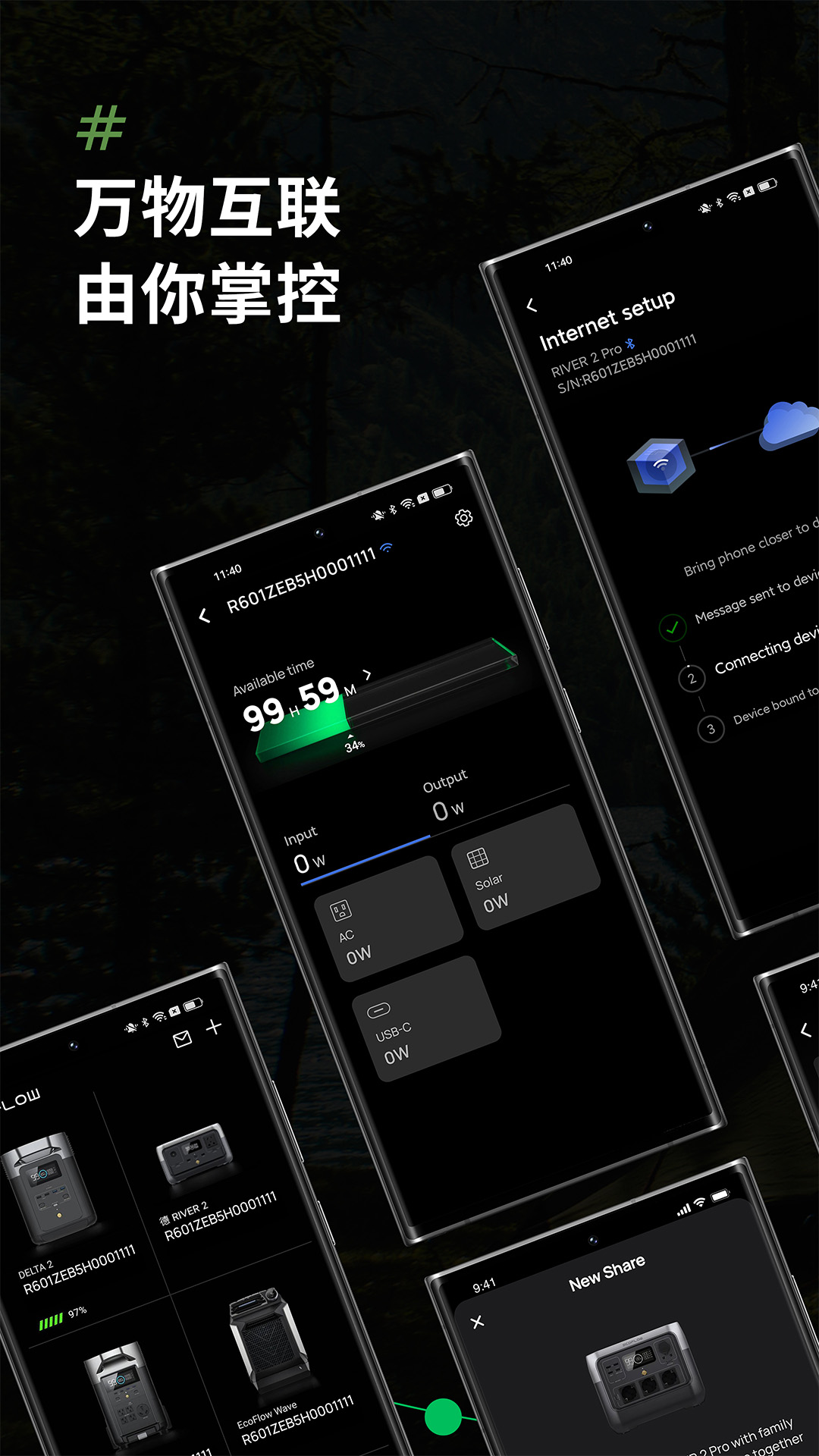 随时随地掌控您的正浩设备。通过蓝牙或 Wi-Fi 连接您的所有设备,即可通过App查看实时数据,例如电量和输出功率。 概览 - 通过App查看电量、充电时间以及电池健康状况和运行温度。 实时统计 - 检查任何电源的输入功率,包括太阳能电池板和交流电源。除了全面了解您的输出功率外,还可以深入了解您的 EcoFlow 装置并查看每个端口的输出。 自定义设置 - 使用该应用程序来调整设备的几乎所有功能,例如,调整充电速度延长电池循环寿命,设置端口或整个设备的自动切断时间。 远程控制 - 直接在舒适的沙发上控制您的所有设备。在家中使用 Wi-Fi 监控您的设备,连接到蓝牙或当您前往户外时将您的设备变成热点,以便在没有网络的情况下进行控制。 固件升级 - 当您的设备固件升级时获取更新。轻按一下按钮即可轻松更新固件,确保您的设备安全且正常工作。