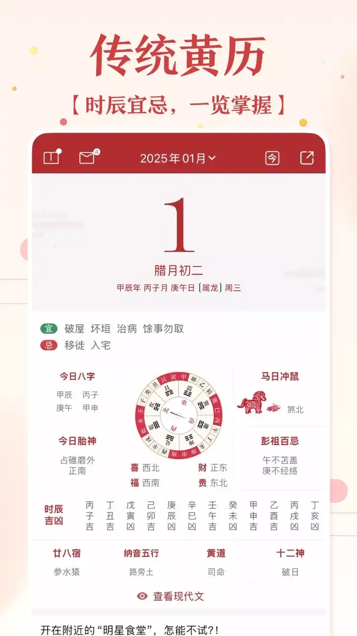 万年历黄历,一本老黄历百科全书,适合国人使用的老黄历。 丰富的黄历信息,如每日宜忌、时辰宜忌、节日节气等,还有更多适合你的精彩内容。 【联系我们】 官方网站:https://m.51wnl.com/ 官方微博:万年历APP官方 微信公众号:youloftwnl qq交流群:186720268 微信号:wnl512022