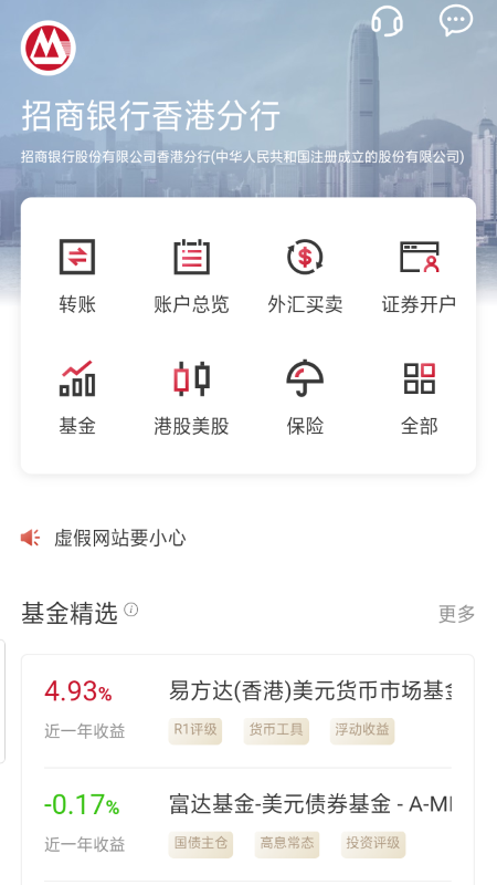 免责申明: vivo应用商店仅为信息发布平台,不对第三方发布的金融产品信息真实性及准确性负责,也不提供投资、理财、贷款等服务。vivo和金融产品之间不存在任何关系,不构成任何担保或承诺。提醒您使用此类应用时提高风险意识,勿将身份证号码、银行卡密码、验证码等敏感信息透露给第三方,如您通过vivo应用商店进入第三方网站或应用进行投资、理财、贷款等行为,由此产生的损失,vivo不承担任何责任。<br><br>小编提醒:投资有风险,选择需谨慎!软件商店提醒您,软件商店仅作为应用程序分发及信息发布平台,不提供相关金融服务,不构成任何担保或承诺;请您使用此类应用时谨慎选择,充分了解风险,理性投资,保护自身财产安全!<br><br>详情描述:香港一卡通是招商银行为在香港有存款和理财需求的客户度身打造的一款综合理财银行卡,服务涵盖香港多类账户、多种理财功能,具有全面、安全、便捷、实惠的服务特色。<br>香港一卡通服务范围包括:现金存取、定活期业务、转账汇款、货币兑换、支票业务、银证转账、ATM取款、POS消费等。<br>香港一卡通手机银行APP客户端为用户提供账务查询、转账汇款、股票交易、基金买卖、定活期、外汇买卖等线上金融服务。