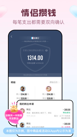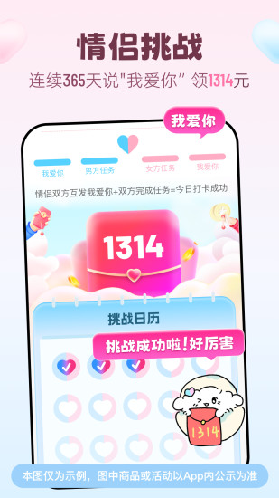 欢迎加入恋爱记!与最爱的人参加1314打卡,情侣共同攒钱,共筑美好未来。一起养云宝,记录心情日记,培养属于你们的甜蜜回忆! 【共同目标】 1314打卡:情侣365天互说我爱你甜蜜打卡,赢1314元甜蜜现金奖励! 情侣攒钱:情侣共同攒钱,助力共同目标与爱情守护! 100件小事:和TA完成爱的一件件小事,记录甜蜜瞬间~ 【情侣一起玩】 云宝:与TA一起培养专属“云宝宝”,见证爱情的成长与陪伴~ 情侣小镇:一起打造专属小镇,体验情侣间的幸福互动~ 你画我猜:猜画猜出爱,让你们的恋爱更有趣! 【恋爱守护】 用机记录:随时了解TA的动态,连接心与心的每个瞬间! 姨妈助手:精准记录生理期,守护她的健康每一天~ 共享日程:与TA同步每一天,增进彼此亲密感与信任! 情侣闹钟:异地恋也要和TA说早安晚安! 【互动记录】 纪念日:记录每个特别的瞬间,让爱情的纪念日永远温暖心间! 心情日记:两人的专属心情日记,分享彼此的喜怒哀乐! 开罚单:情侣趣味罚单,轻松化解生活中的小摩擦~ 拍照姿势:轻松摆出完美姿势,告别拍照烦恼! 【更多功能】 探索更多惊喜功能,与TA一起记录爱情点滴,发现每一个甜蜜瞬间。
