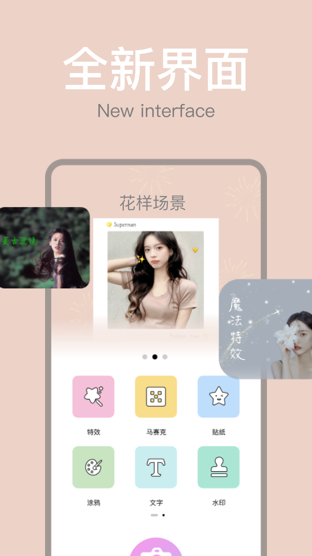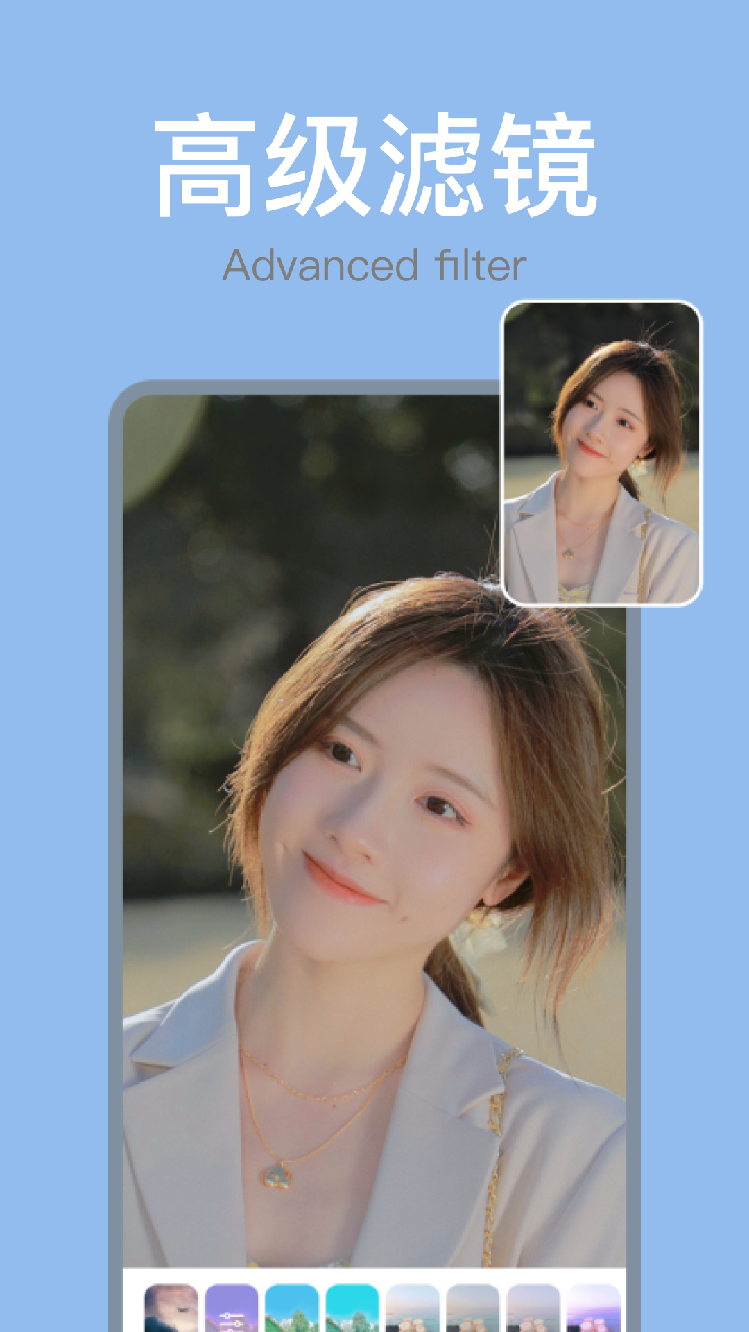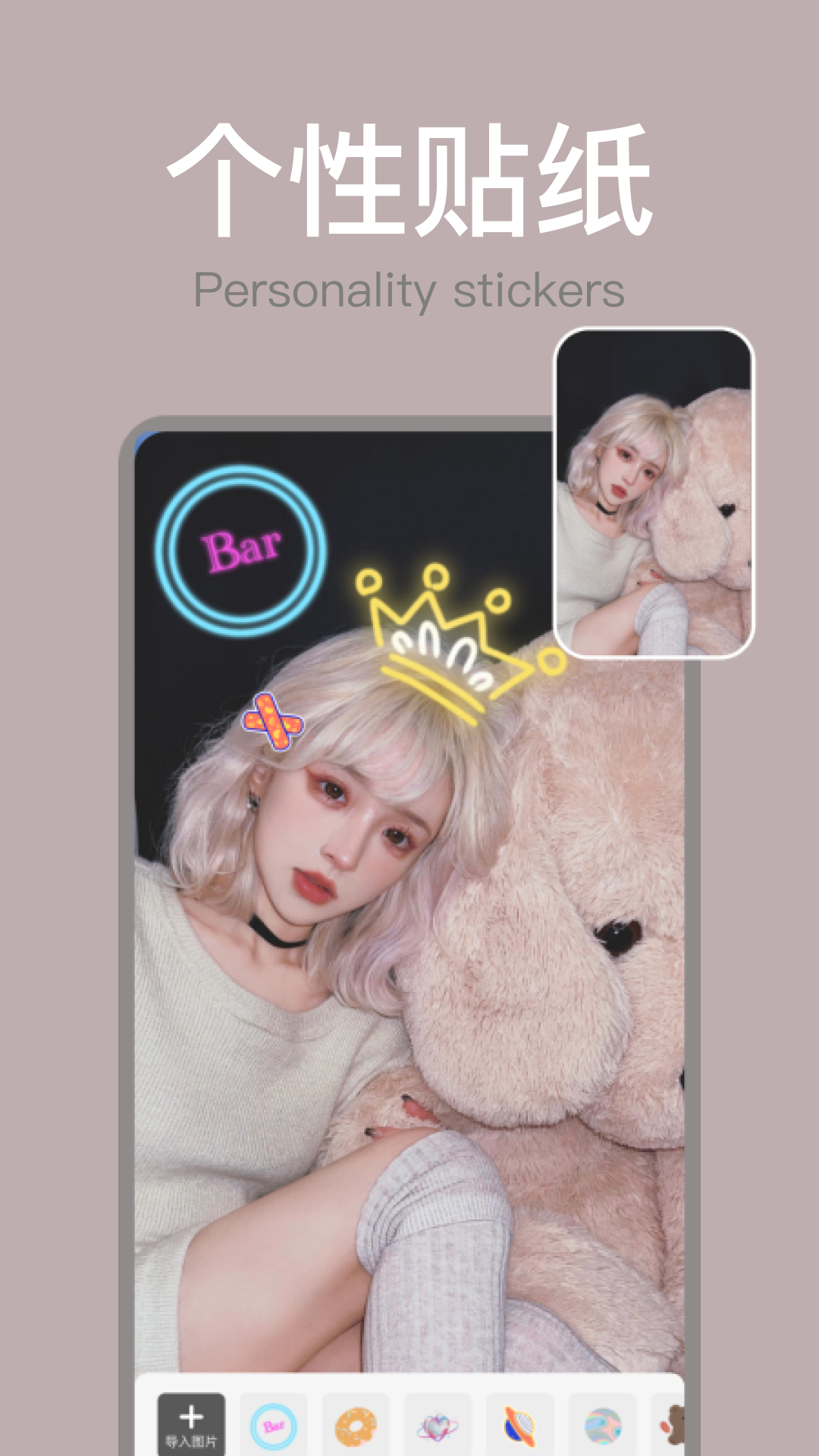 本应用是一款美颜自拍美图拼图照片编辑神器。滤镜美颜实现美白美肤的效果;瘦身功能让您实现瓜子脸、大长腿的梦想;花样拼图、有趣的背景,让您的照片更加时尚,营造出广告大片的氛围;还有画中画功能增加了照片的趣味性;强大的修图功能,实现您全方位修图的想法,更有趣味贴纸增添无限乐趣。