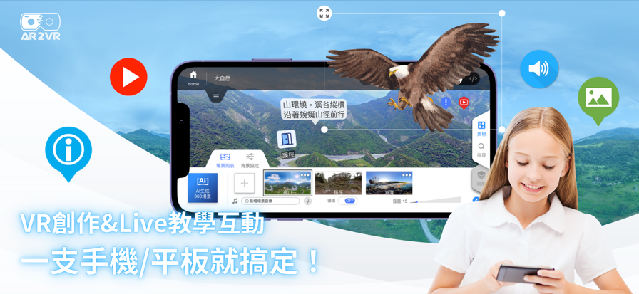 『輕便、穩定、快速』的導覽眼鏡APP,輔助於教育以及協助企業產品VR展示,直覺瞄準照片就能跳進該照片的VR世界。透過AR與VR技術協助教師製作趣味又身歷其境的尋寶課程,提升學生的學習動機。擁有離線使用的功能,不必擔心在網路狀態不佳的場域使用,只要體驗前將導覽包下載完即可。人手一機分組討論分工合作完成學習單,讓學習就像尋寶闖關一樣有趣。 只要事先提供360環景照片、資訊點文字、背景音樂與辨識圖,搭配AR2VR App 就能輕鬆製作VR互動課程。 ***操作步驟*** 操作影片:https://youtube.com/playlist?list=PLb_BKPidRXIZQRicKTCRoUIKuRH0_YBD4&si=gKI68J9_uM7YeVPf