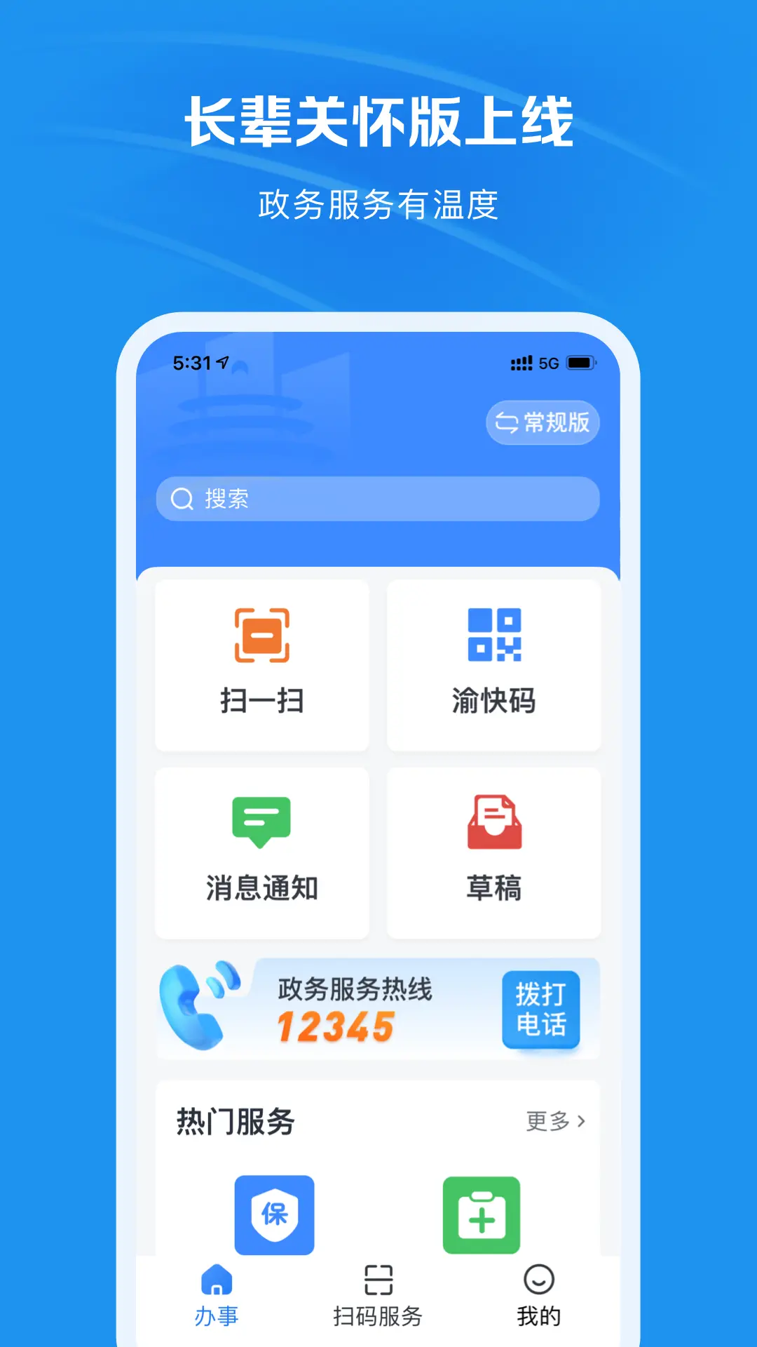 “渝快办”APP是重庆市专为本地群众企业打造的“掌上办事”超级移动终端,通过“渝快办”APP群众企业可以足不出户在线办理各类业务、享受海量便民服务。<br><br>(1)掌上办,服务高效便捷。<br>海量服务,掌上集成办理。<br>资料提交免重复,畅享高效便捷。<br>(2)码上办,服务无处不在。<br>扫码亮证,快享“码”上服务。<br>便民惠企,实现“一码办事”。<br>(3)就近办,服务一点即达。<br>“就近办”身边网点一图尽览。<br>指尖一点,路线导航即刻出发。<br>(4)暖心办,服务更有温度。<br>“渝快办”长辈版,色暖字大更清晰。<br>高频服务一站办,亲友代办更暖心。