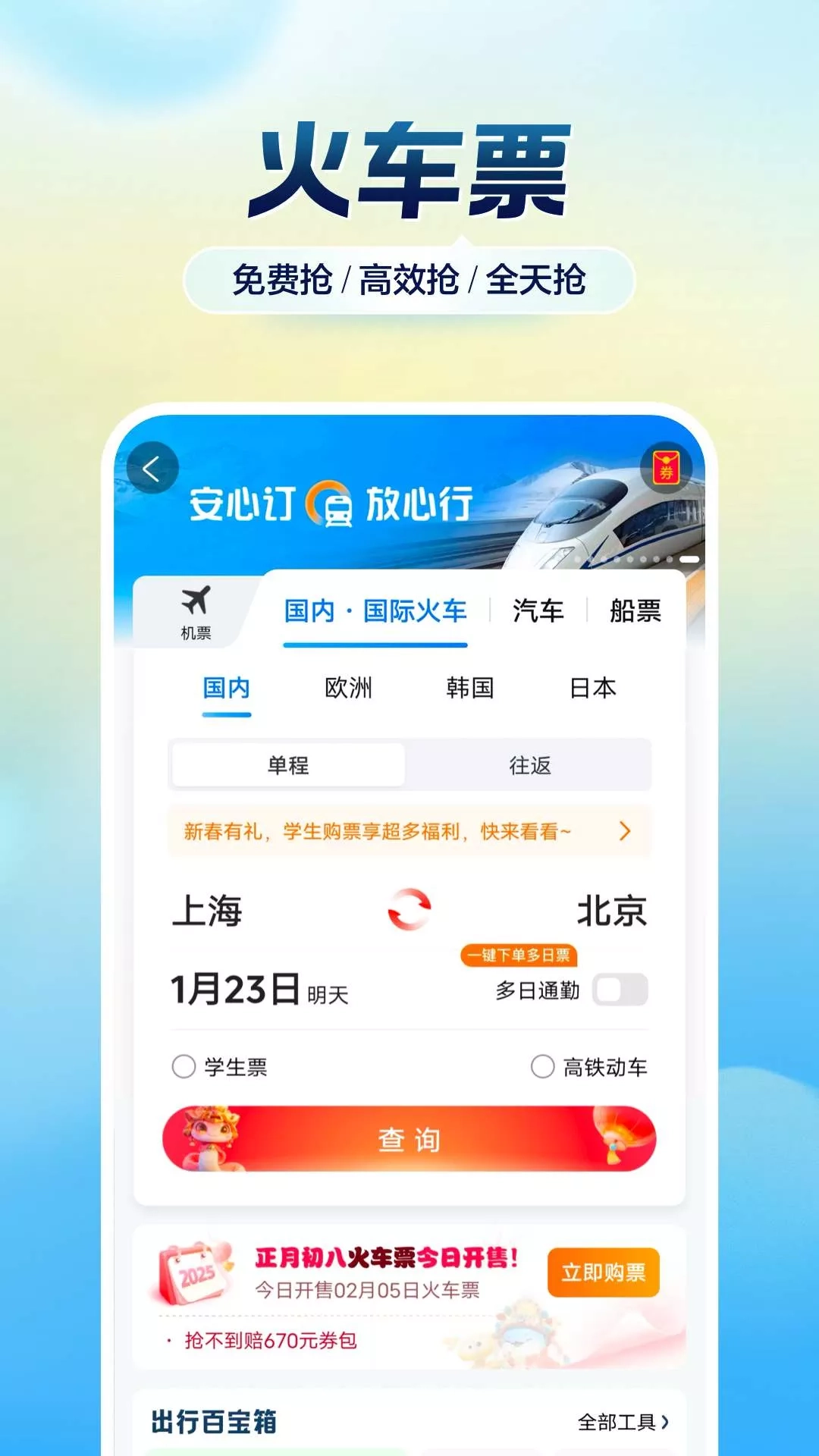 智行火车票(12306官方出票)-火车票、机票、酒店、汽车票、门票、船票一站式出行预订平台。 出行神器,提供火车开售时间、正晚点、候补人数查询等一站式出行服务,功能全面助您旅途顺心! 主要产品与服务: 【火车票】 [线上选座] - 在线选择心仪座位,下铺、靠窗随心选。 [免费车票] - 积分兑车票,0元免费坐火车。 [自动抢票] - 可提前预约下单,开售时自动秒杀出票;不仅抢候补,也能抢余票。 [24小时抢] - 可全天24小时抢票,有专人帮抢,成功率高,抢不到就敢赔。 [抢票福利] - 靠窗、下铺免费抢,学生还有全年免费抢票福利,抢不到免费升坐席。 [余票捡漏] - 各条线路隐藏余票一键检索,免费监控,即刻解决无票难题。 【特价机票】 买机票,先来智行比价,全球低价尽在智行。 【低价酒店】 独家功能,低价监控,有房监控,平台还可以帮您跟商家还价,低价不错过。